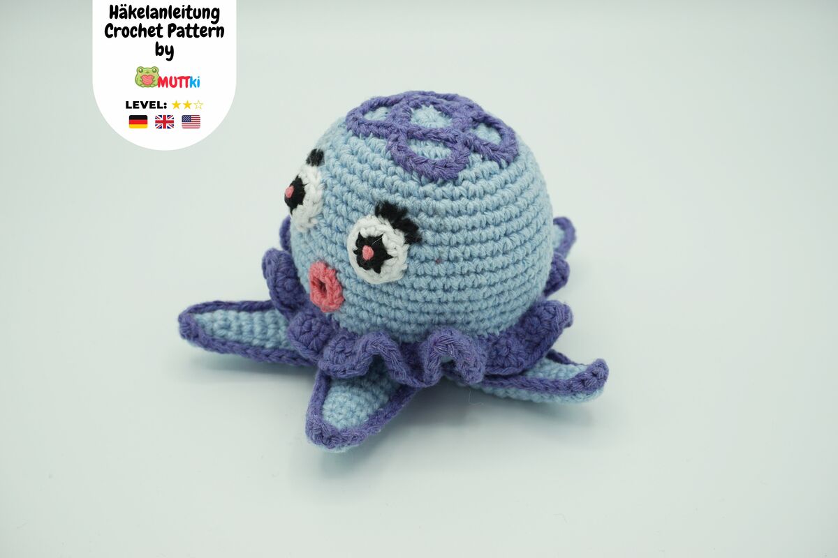 Eine Muki-Qualle ⇝ Häkelanleitung auf 5 bunten Seiten im PDF-Format zum selber Häkeln (jeweils in deutsch, amerikanisch, britisch).