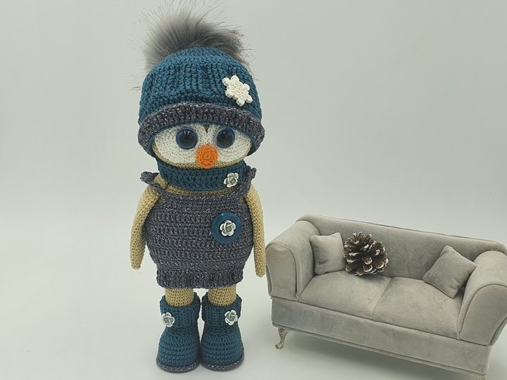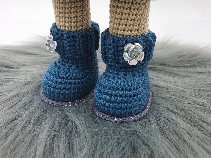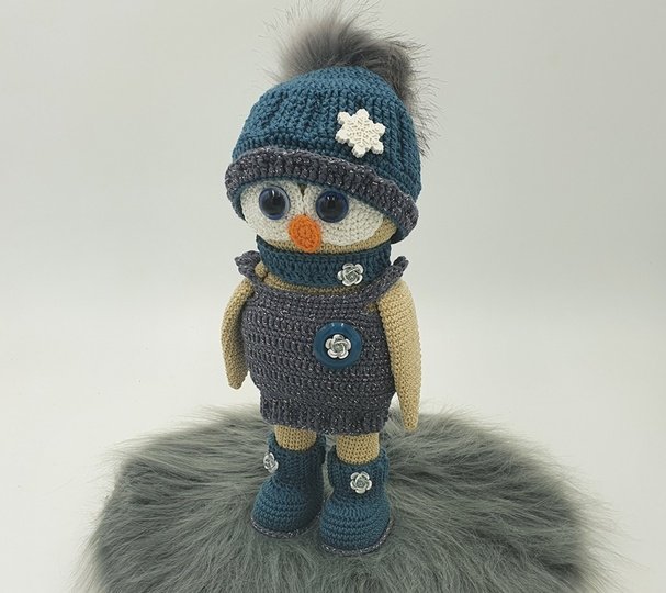 Mit den angegebenen Materialien (Baumwolle 125 m - 50 g) und Häkelnadel 2.5 mm wird "IDA" ca. 29 cm hoch (ohne Mütze).