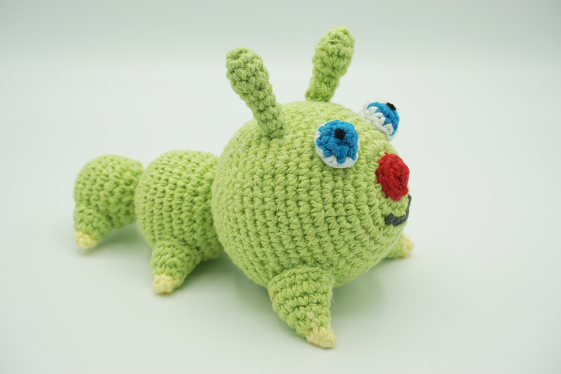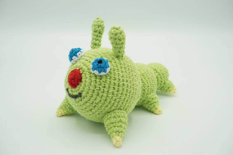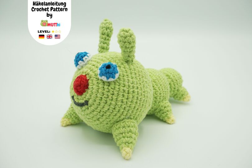 Eine Muki-Raupe ⇝ Häkelanleitung auf 5 bunten Seiten im PDF-Format zum selber Häkeln (jeweils in deutsch, amerikanisch, britisch).