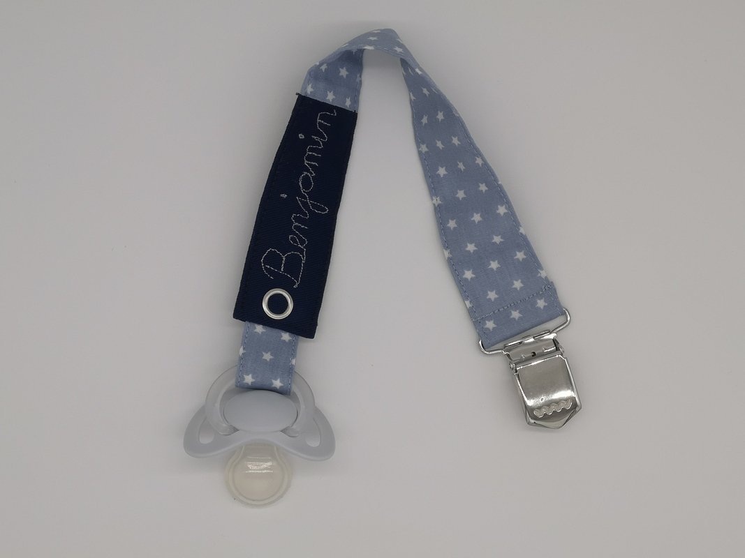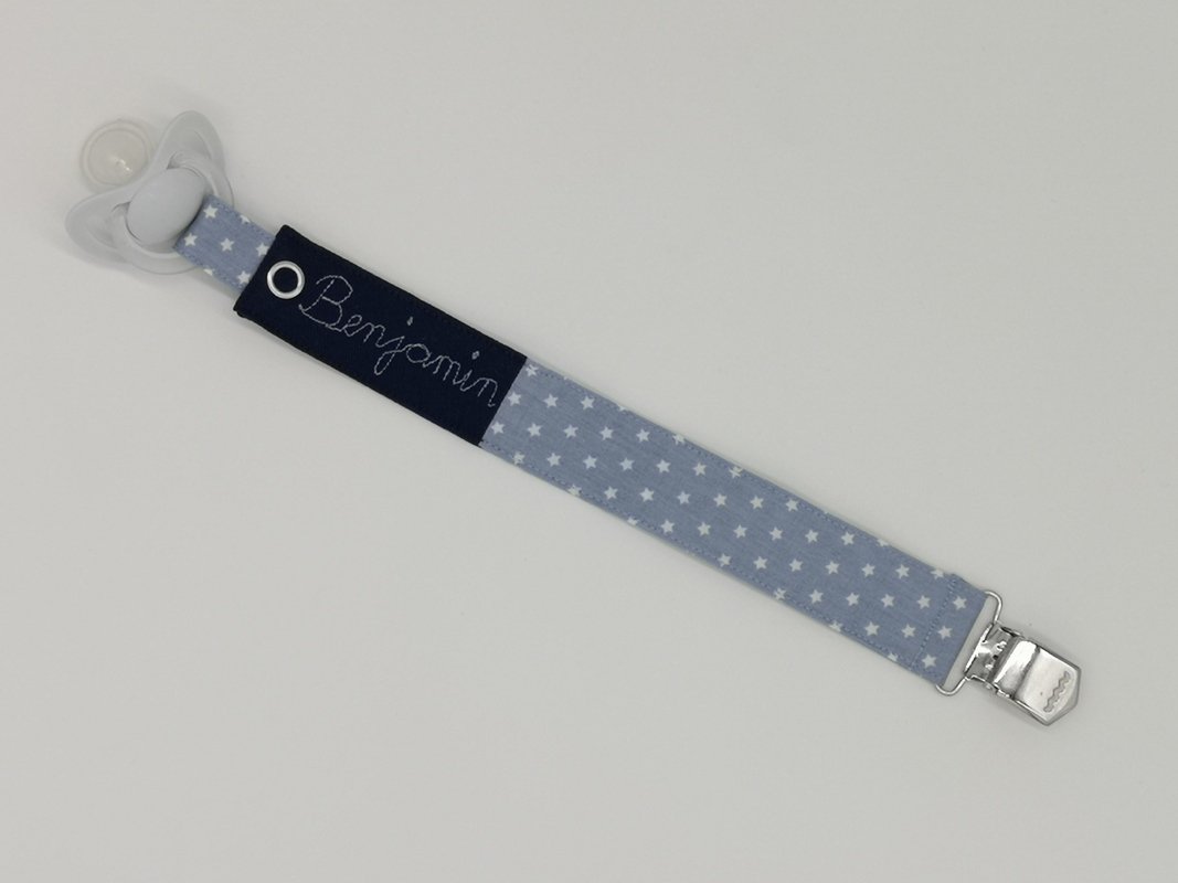 Wie wäre es mit einem Schnullerband mit aufgesticktem Namen?