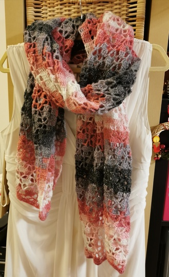 Die Größe ergibt sich beliebig aus der Art des Garns und je nachdem wie breit und wie lang man die Schal-Stola machen möchte.
