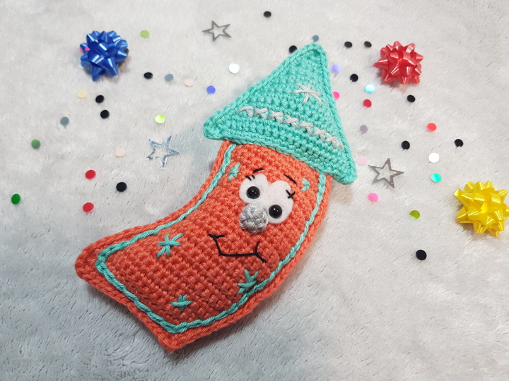 Die Rakete ist ca. 7 x 15 cm groß. Die Größe kann variieren, je nachdem welches Garn und Nadelstärke man verwendet, auch die Farben kann man beliebig zusammen stellen.