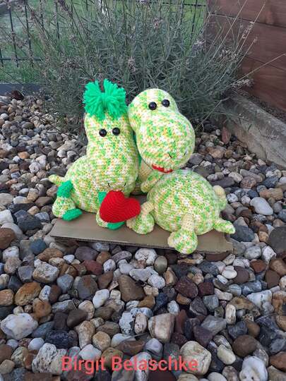 Die Beiden sind 25 cm hoch und 36 cm breit....Wenn mit der angegebenen Wolle und Häkelnadel 2,5 gehäkelt wird. Mit Nadel 3 werden Paula und Paulchen größer.