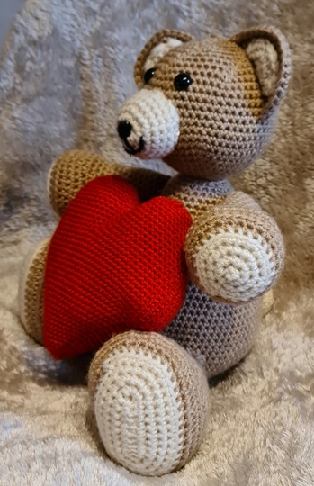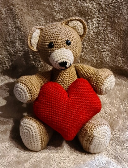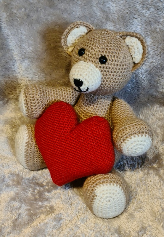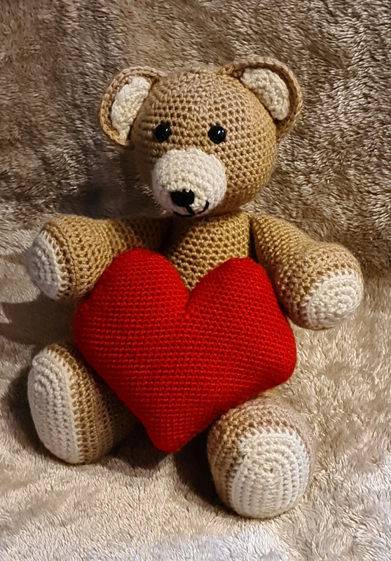 Ich habe den Bär mit Acrylgarn gehäkelt mit Häkelnadel 6 mm und das Herz mit 4mm.