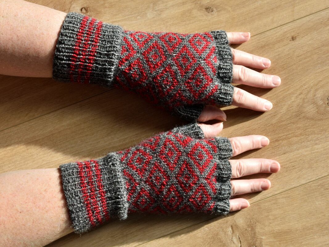 Ein leuchtend-rotes Rautenmuster in Einstricktechnik vor einem grauen Hintergrund machen diese fingerlosen Damenhandschuhe zu einem echten Hingucker. Das Einstrickmuster ist schnell verinnerlicht und auch gut für Anfänger dieser Technik geeignet, da die Farbwechsel kurz gehalten sind und so die Länge der Spannfäden auf der Rückseite der Arbeit gut justiert werden kann. Zusätzlich sorgen die Spannfäden für ein extra warmes Handgefühl.
