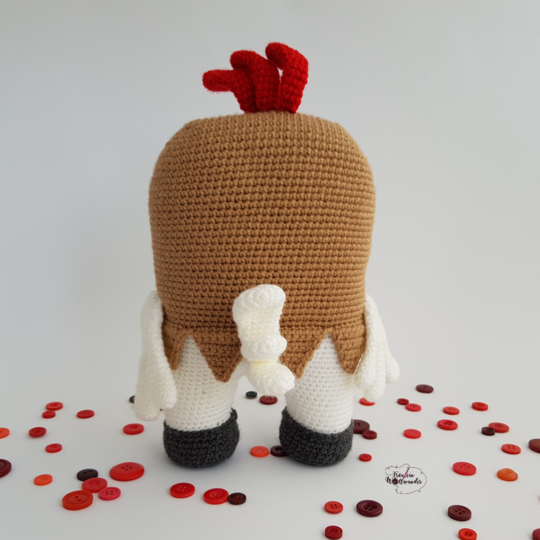 Wenn du Hugo mit der angegebenen Wolle häkelst, wird er am Ende ca 26 cm hoch und 16 cm breit (ohne Hahnenkamm)