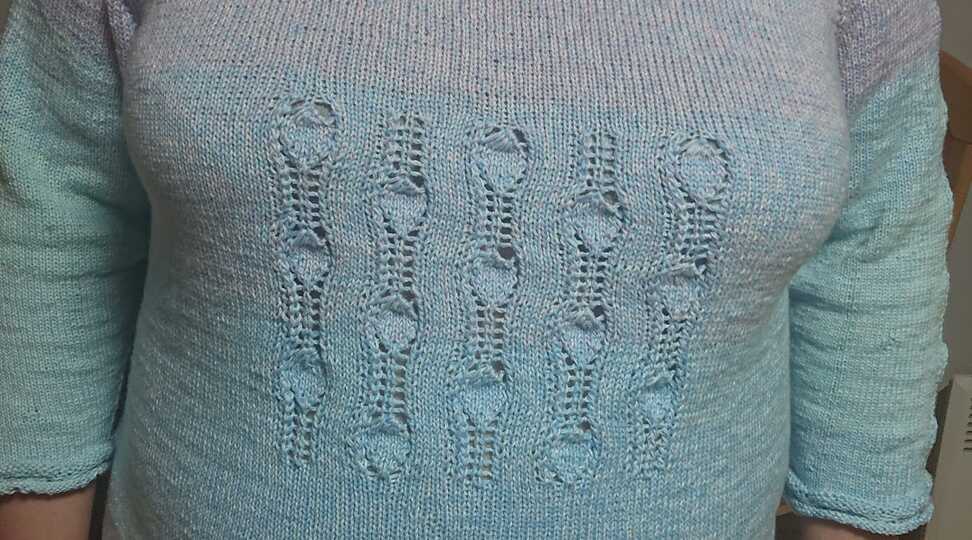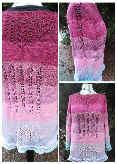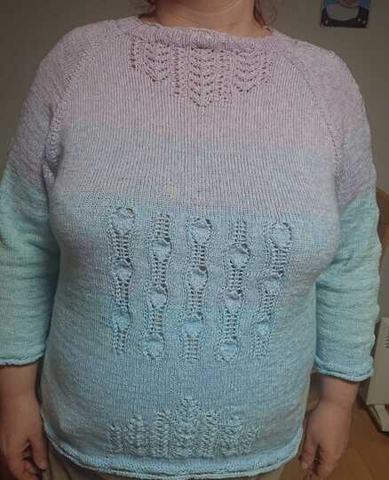 Gestrickt wird in Runden von oben. Begonnen wird mit einem kleinen Kragen, dann werden die Maschen in 4 Teile unterteilt, die an beiden Seiten von den sog. Raglanlinien abgegrenzt werden.