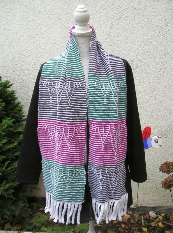 Für den Schal braucht man ca. 110 g weiß, je ca. 30 g rot, grün und grau. .Er wird kraus rechts mit einem Hebemaschenmuster gearbeitet. Begonnen wird mit den Fransen, aus denen man Maschen aufnimmt für die Breite des Schals, Danach strickt man immer abwechselnd mit weiß und einer der anderen Farben. Das alles ist nicht schwierig, so dass auch Strickanfängerinnen gut damit zurecht kommen sollten. Bei Schwierigkeiten helfe ich auch gerne weiter.