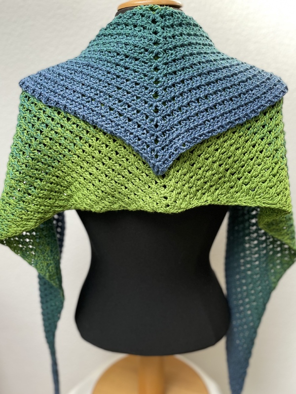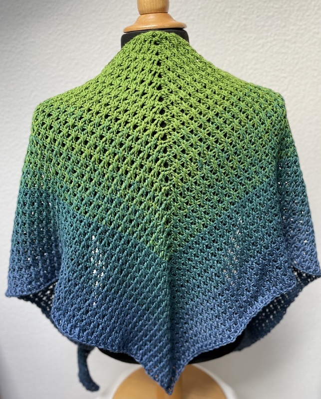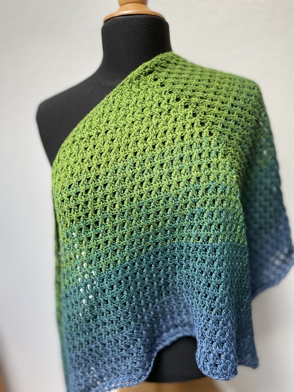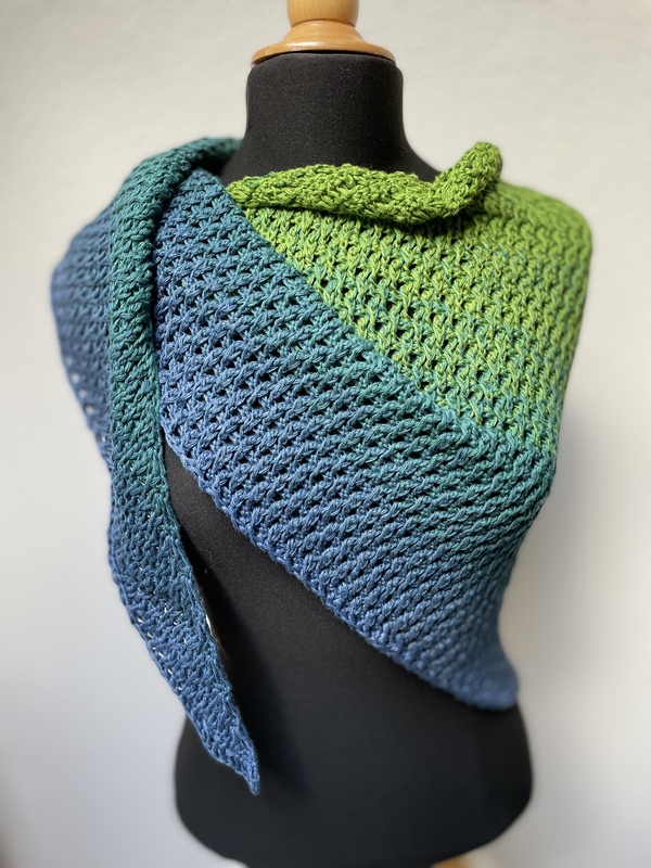 Mein Beispieltuch hat eine Spannweite von 1,70m. Gearbeitet wurde es mit einem 4-fädigen Bobbel mit 750m Lauflänge und Nadelstärke 5, da ich sehr fest häkle.