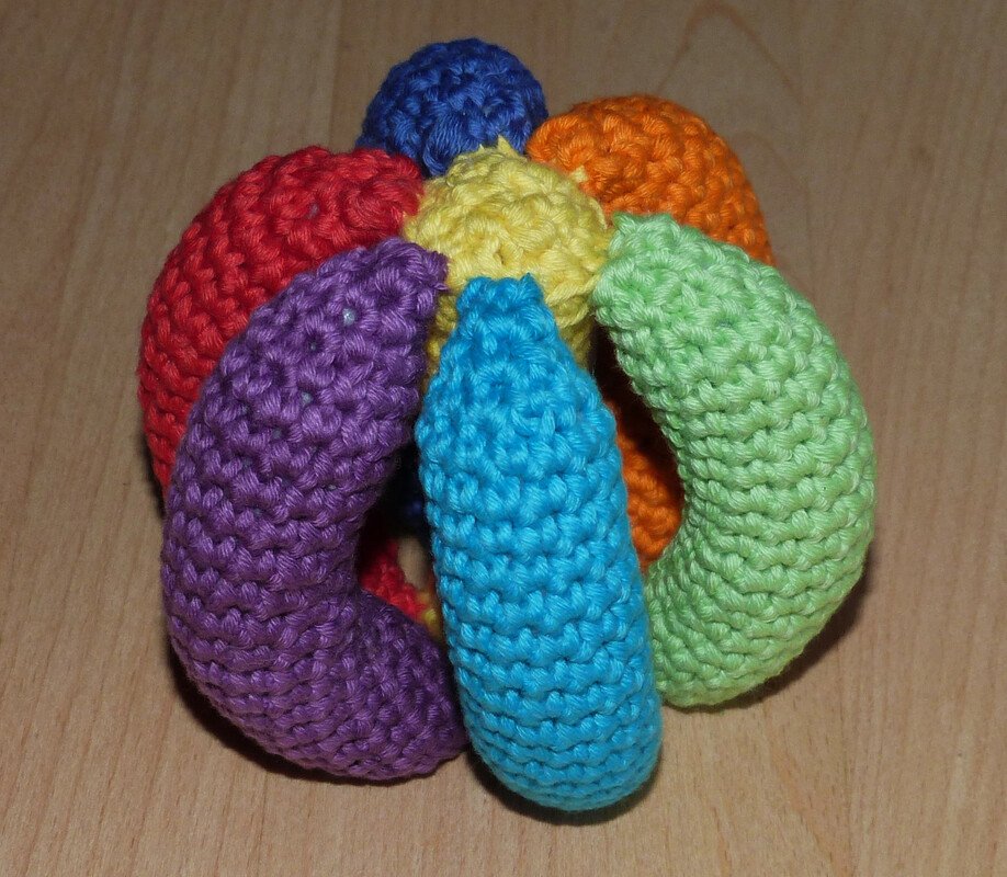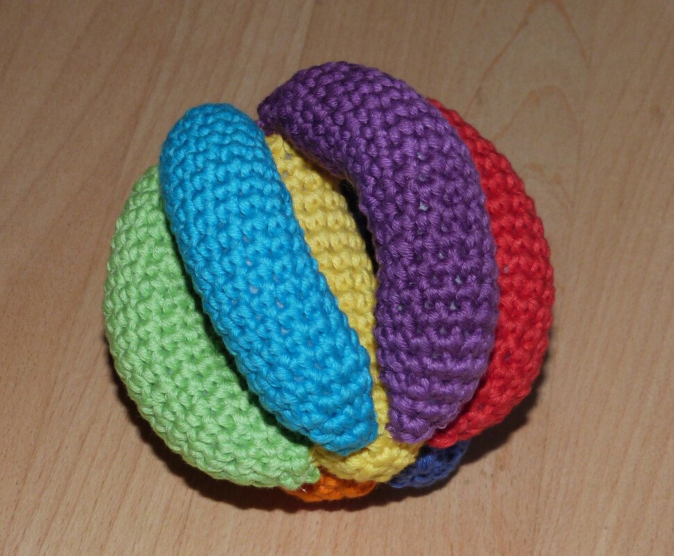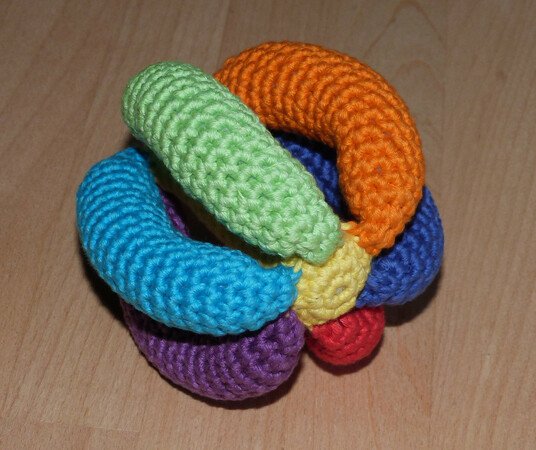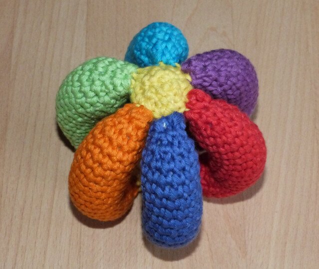 Der Greifball ist ein tolles Spielzeug für bewegungsfreudige Babys ab ca. 6 Monaten und bietet viele Möglichkeiten, motorische und sensorische Fähigkeiten zu trainieren: Man kann ihn fühlen, greifen, sehen, hören, werfen, rollen und hinterher krabbeln. Das gehäkelte Spielzeug ist leicht und es geht nicht kaputt, wenn es mal runterfällt!