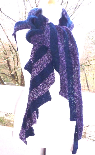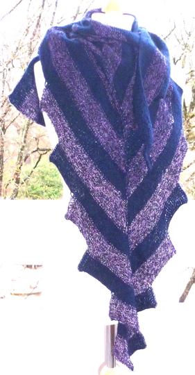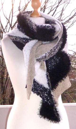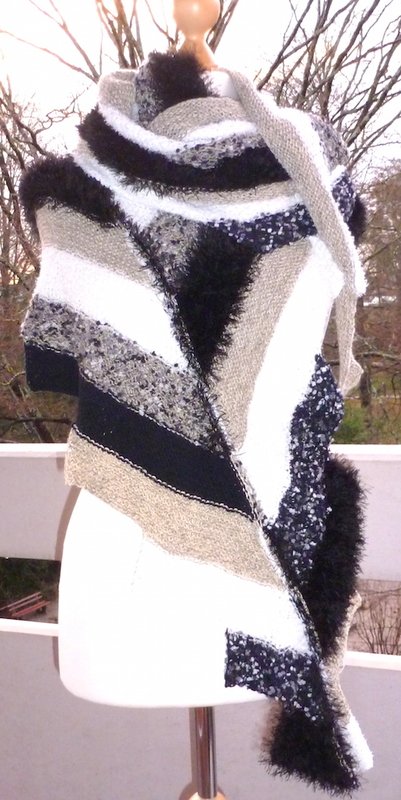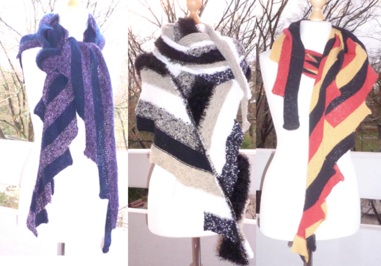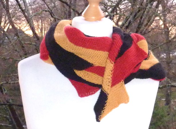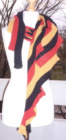 Dieses Tuch beeindruckt durch die Form mit Streifen und Zacken, die in einer Spitze enden. Es kann mit 2, 3 oder 4 Farben oder auch ganz bunt gestrickt werden. Oder ihr kombiniert verschiedene Effektgarne! Die dreifarbige Variante eignet sich z.B. auch prima für Landesfarben. Wichtig ist nur, dass die Maschenprobe der gewählten Garne annähernd gleich ist.