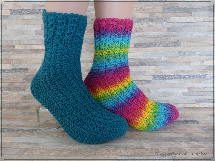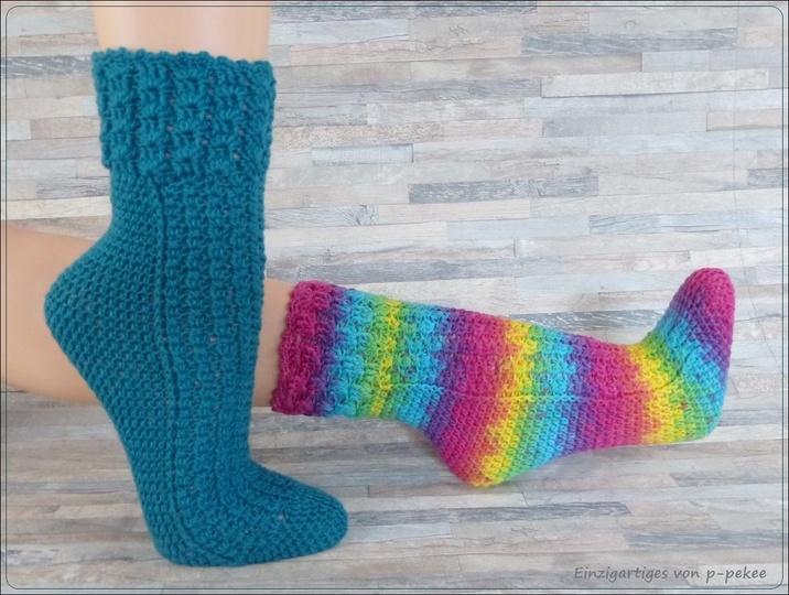 Easy-Soks°15 sind gehäkelte Socken (4-fach-Sockenwolle) ohne komplizierte Ferse - mit schönem Muster und Mäusezähnchenabschluss. Das Bundmuster ist beidseitig hübsch. Die Socken können daher auch als Umschlagssocken getragen werden.