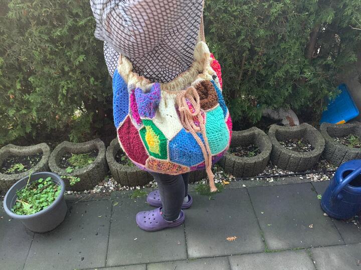 Der Beutel wird ca. 54 cm breit und 27 cm hoch. Dies hängt natürlich davon ab, wie fest oder locker man häkelt.