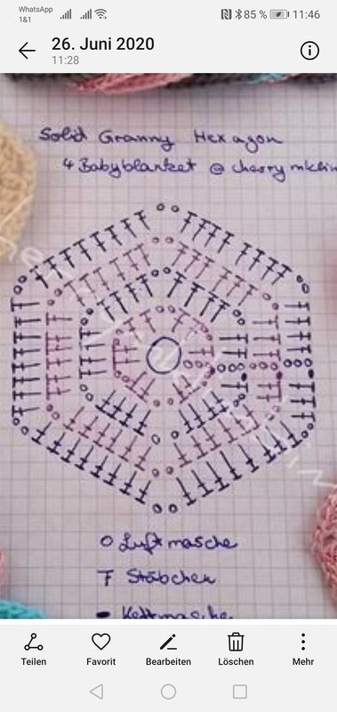 Für jedes Sechseck 10 Gramm Wolle, ich habe meine Reste verwertet. Dieses waren Rellana Caprice in allen erdenklichen Farben und Sockenwolle. Wenn du keine Reste hast, kannst du auch neue Wolle verwenden und natürlich Farben nach Wunsch wählen.