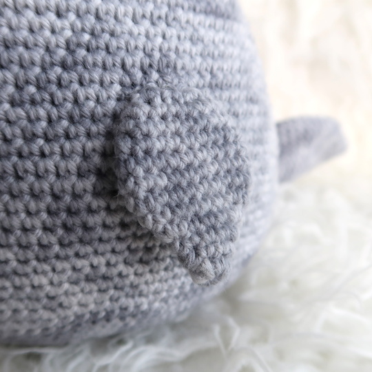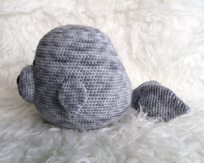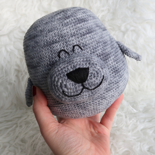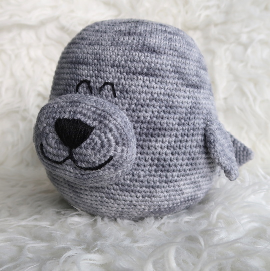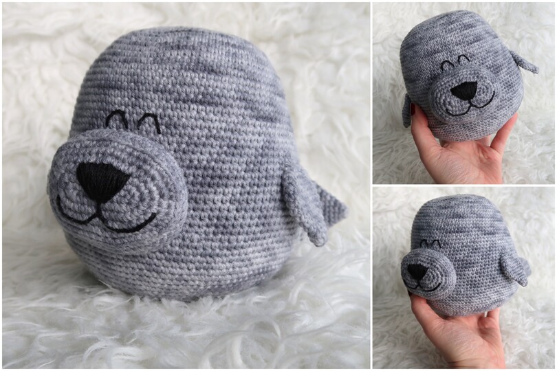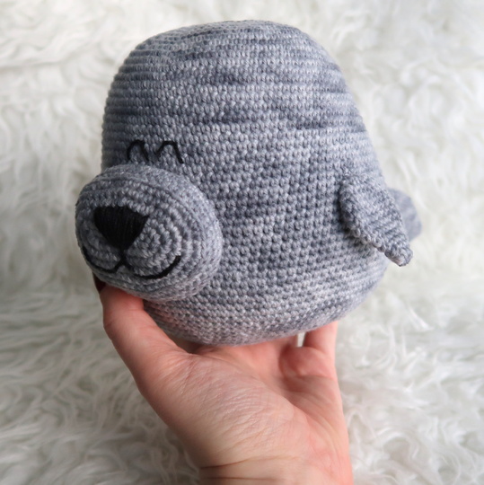 Wenn du mit Baumwolle (125m LL auf 50g) häkelst, wird deine Grinserobbe ca. 25cm lang und 15cm hoch.