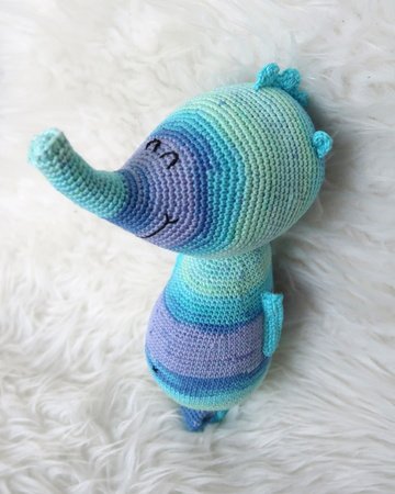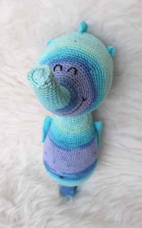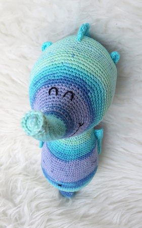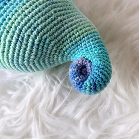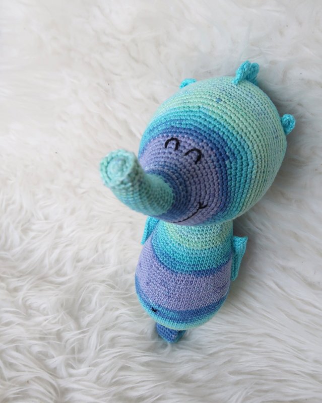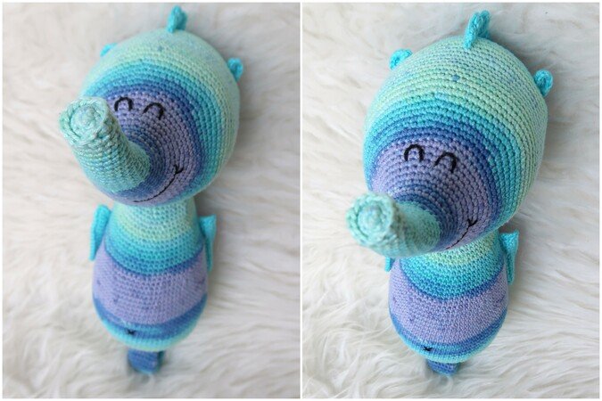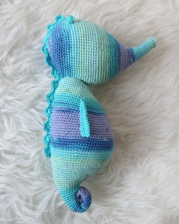 Wenn du mit Baumwolle (125m LL auf 50g) häkelst, wird dein Seepferd ca. 28cm lang.