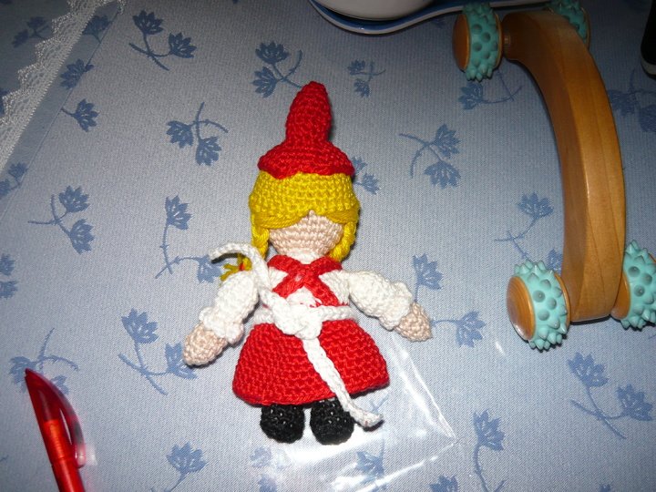 1) Natürlich Wolle und eine Häkelnadel. Ich habe mit Schachenmayr Catania Rot, Schwarz, Weiß, Gelb und Soft apricot und Nadelgröße 2,5 gearbeitet.