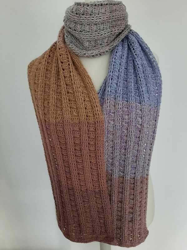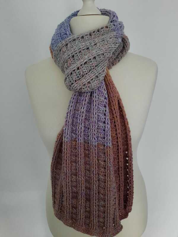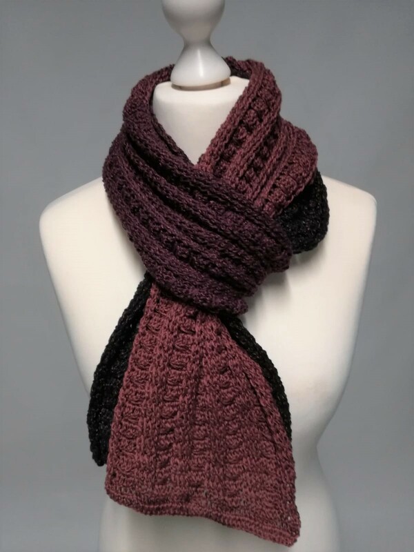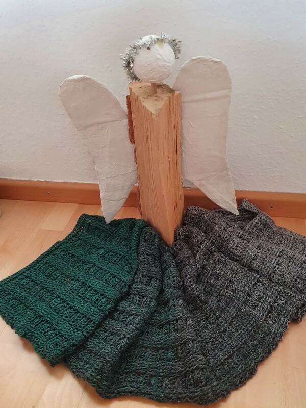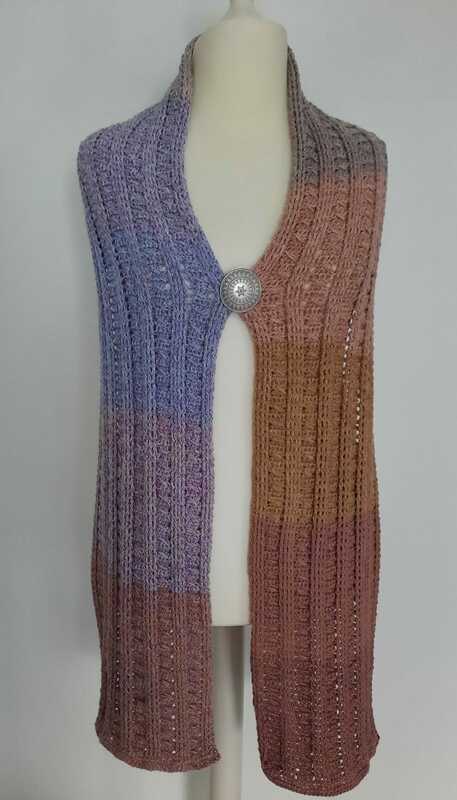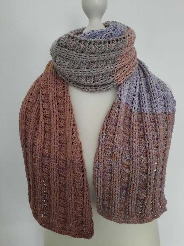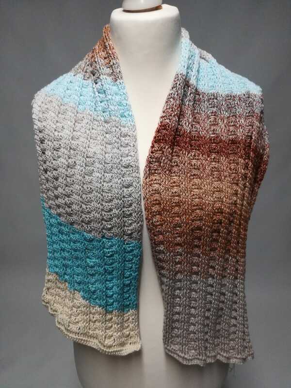 Der abgebildete Schal wurde aus 1000m 4-fädigem Farbverlaufsgarn (Knutschkugel Nr. 29 aus der Mützenstraße) gefertigt und misst 26 x 210 cm.