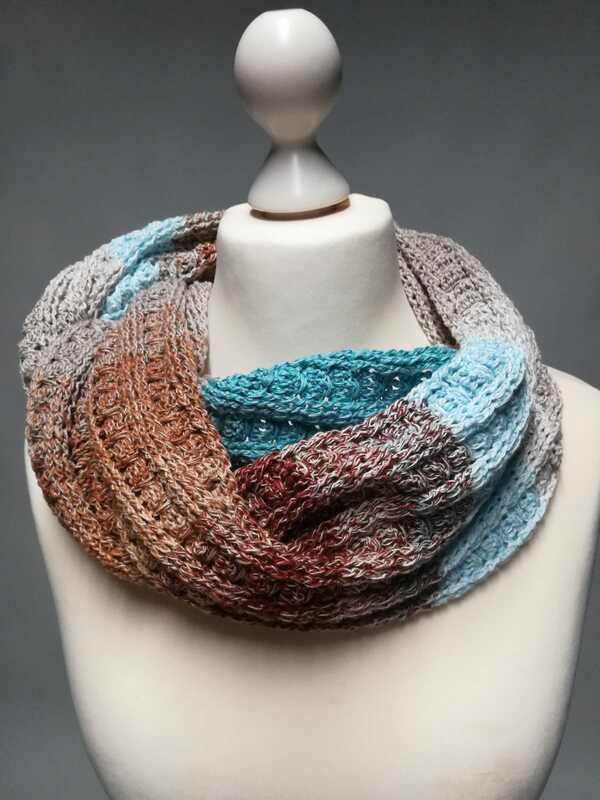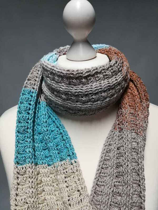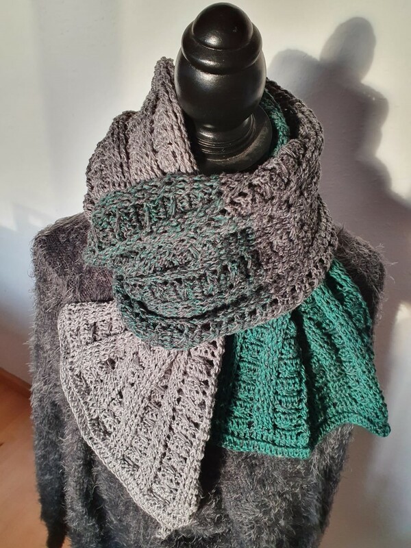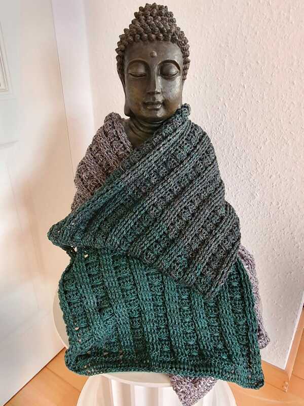 Der Schal bzw. Loop kann in beliebiger Größe gearbeitet werden. Wenn du den Schal breiter häkelst, kannst du ihn auch als Stola tragen.