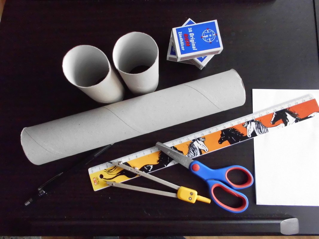 Man benötigt 1 Überraschungsei, 3 leere Streichholzschachteln, Pappe für die Böden, 2 Papprollen von WC-Papier, eine Papprolle von Küchenrolle, Schere, Zirkel, Bastelkleber, 3 Knöpfe oder Perlen, 6 Wackelaugen, Rester von weißen Moosgummi, Füllwatte nur für das Ü-Ei, Häkelnadel 3,5, Nähnadeln.