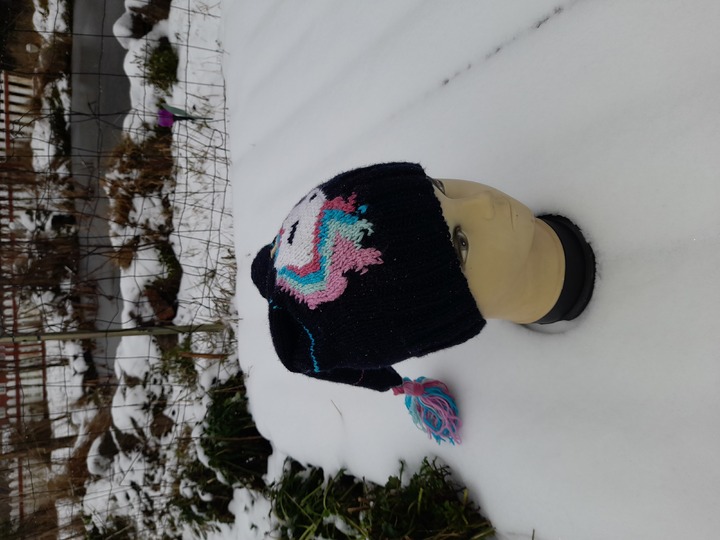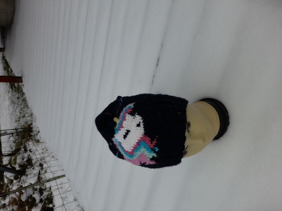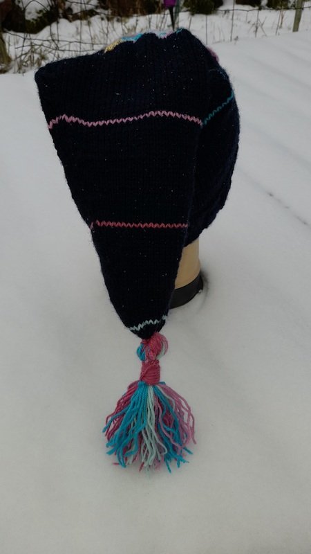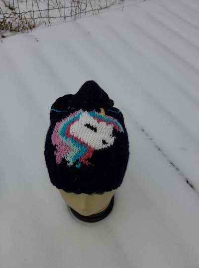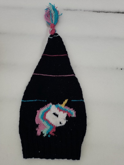 Das Highlight ist das eingestrickte Einhornmotiv und der Quast in den Einhornfarben.