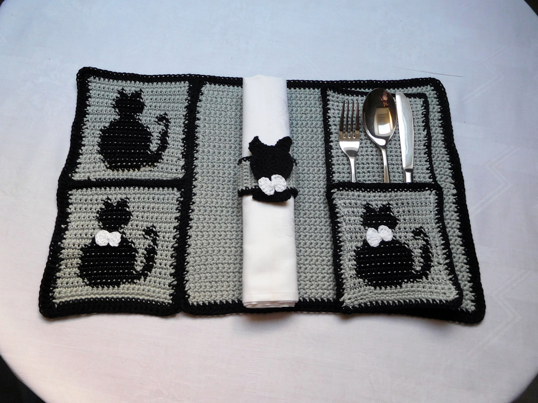 Mit diesem Set, bestehend aus Platzdeckchen, Bestecktasche und Serviettenring, kannst du Katzenliebhabern eine Freude bereiten! Es lässt aber nicht nur die Herzen von Katzenfreunden höher schlagen, auch Kinder haben ihre Freude an den Kätzchen.