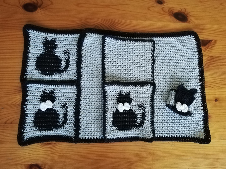 Die Bestecktasche wird mit festen Maschen gehäkelt. Sie besteht aus zwei Teilen, die zusammengehäkelt werden. Die Vorderseite bildet ein Rechteck mit Katzenmotiv, die Rückseite ein einfarbiges