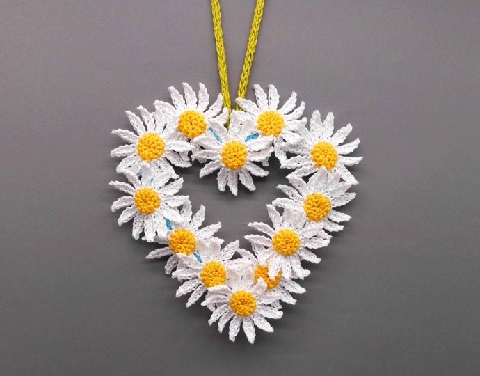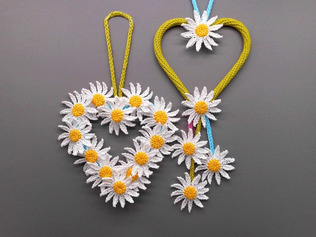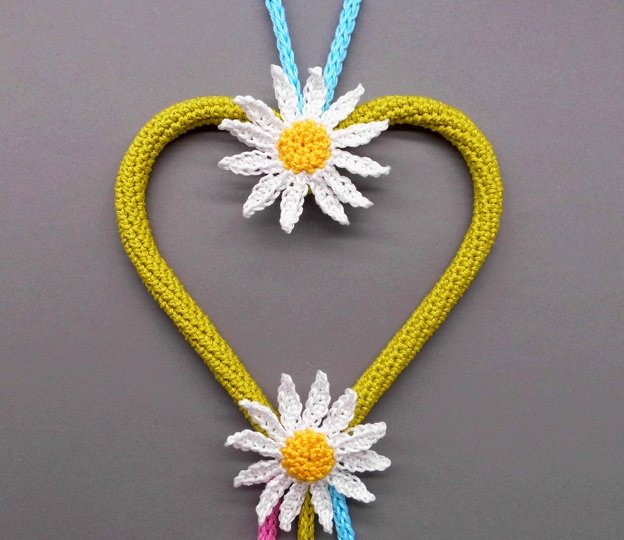 Das Margeriten-Herz lässt sich, auch von Anfängern mit etwas Übung, einfach und schnell häkeln und durch mehr oder weniger Blüten, bunte Bänder oder Perlen ganz nach Wunsch individuell gestalten.
