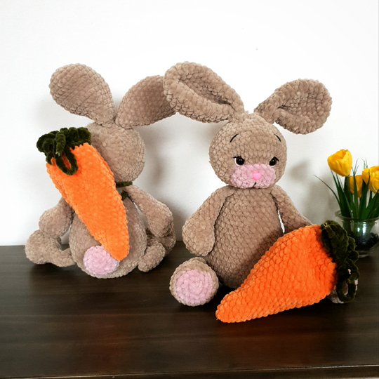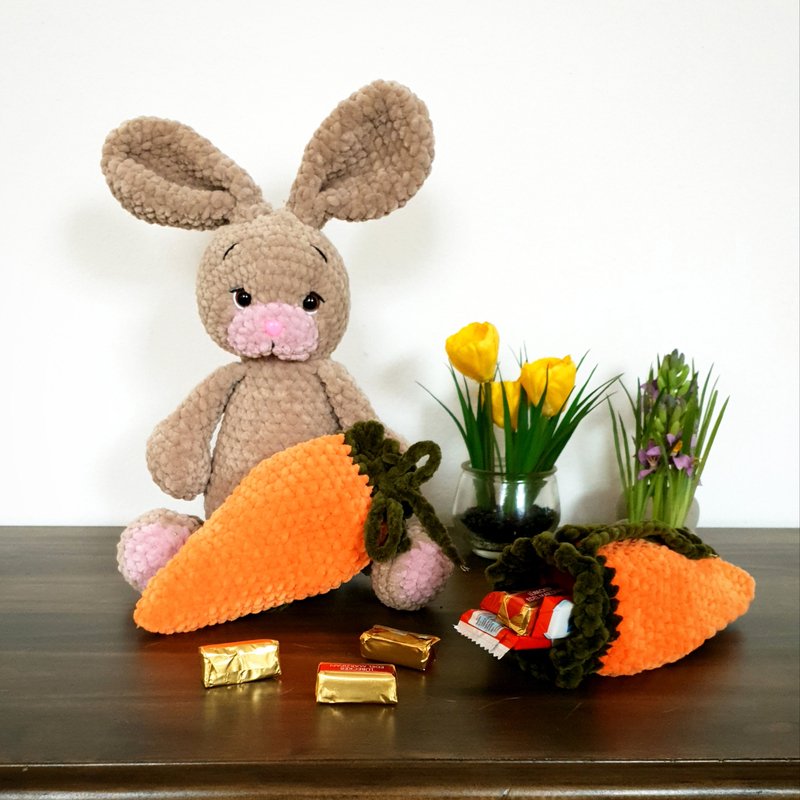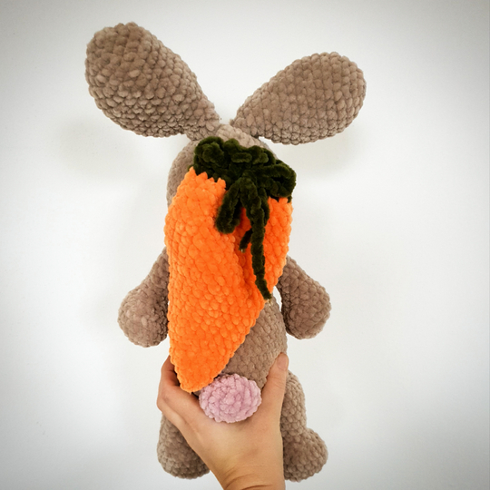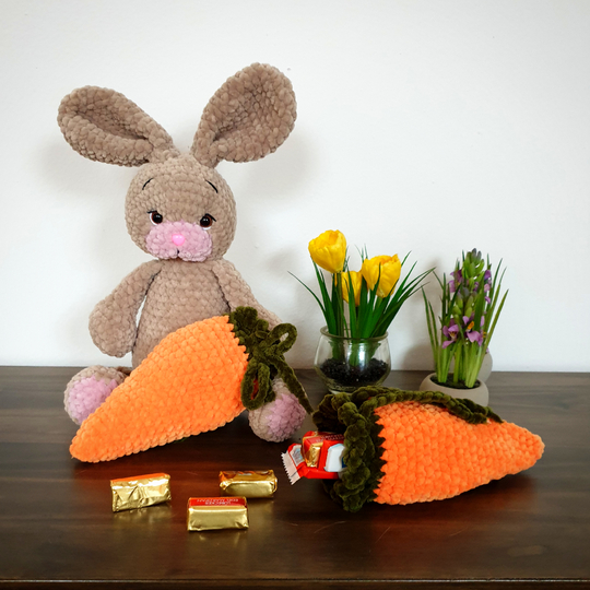 Der kleine Hase Henry spielt gerne Osterhase und hat deshalb einen kleinen Rucksack in Form einer Karotte dabei.