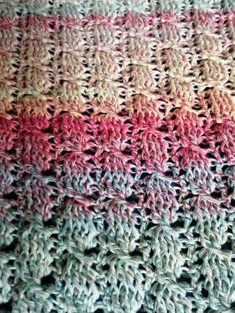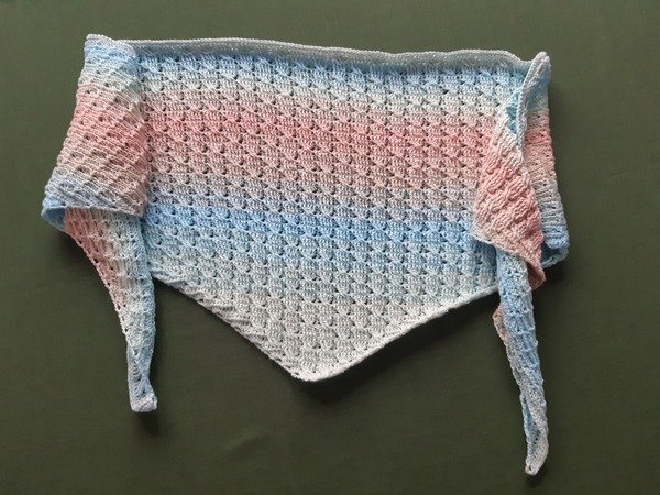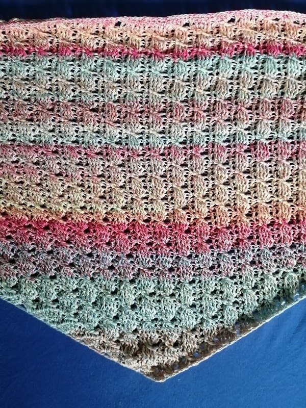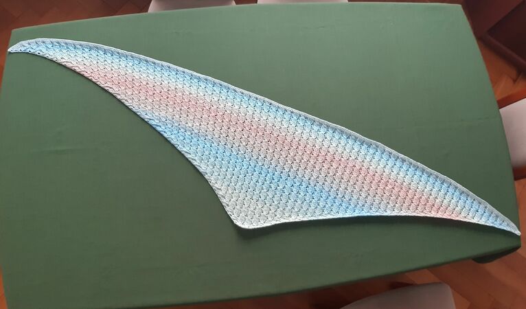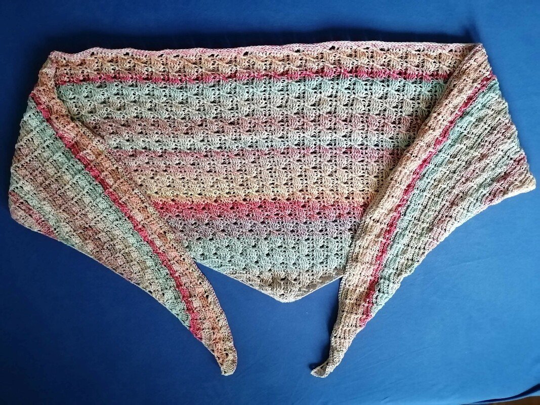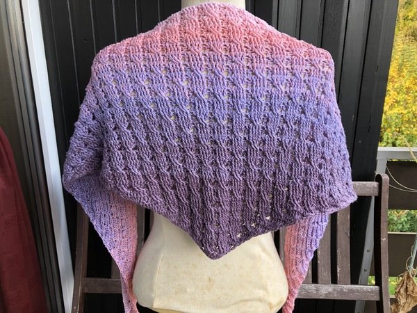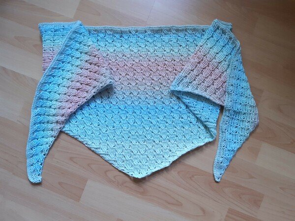 Mein Beispieltuch hat eine Spannweite von knapp 1,70m erreicht. Da sich das Muster endlos wiederholen lässt, kann das Tuch in jeder beliebigen Größe gearbeitet werden.