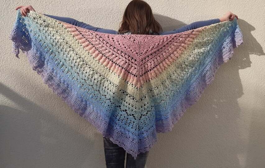 Es erfordert einiges an Zählarbeit und Wolle mit 1500-200m Lauflänge. Dann bekommt man ein sehr abwechslungsreiches, großes Kuscheltuch.