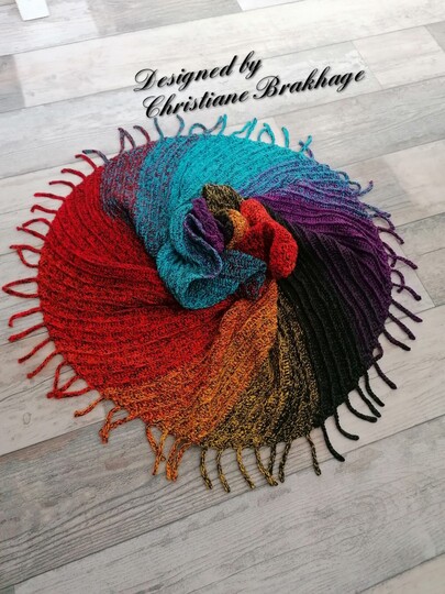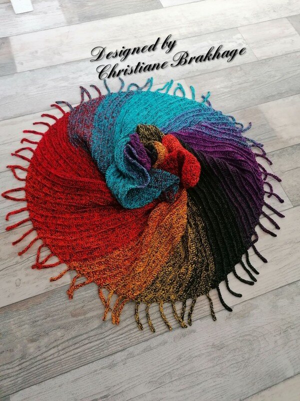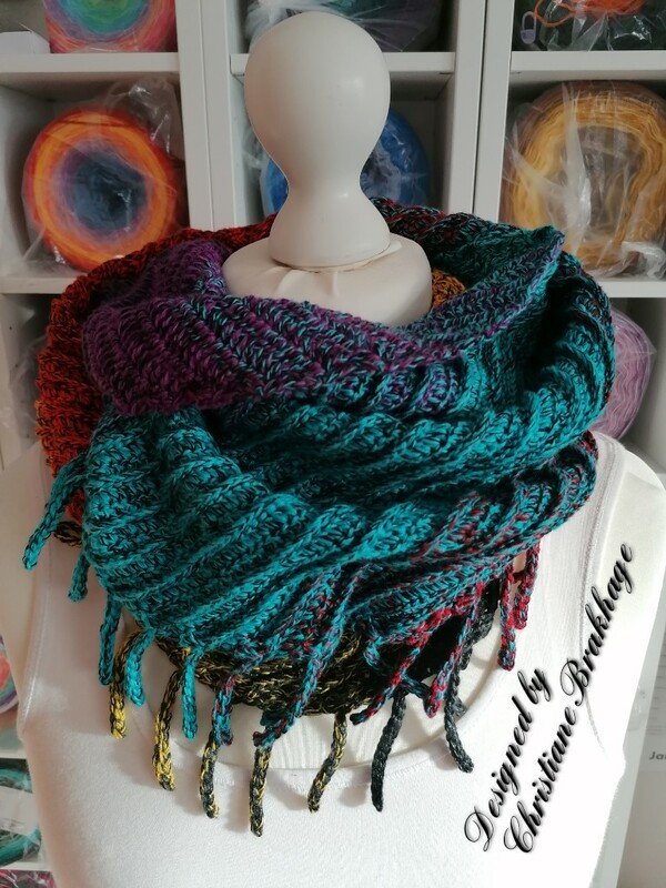 Der fertige Loop hat eine Höhe von ca. 36 cm + Fransen und einen Umfang von ca. 1,25 -1,30 m,