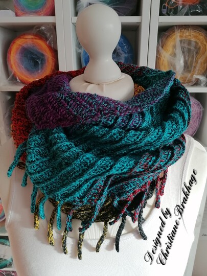Der "Schief gewickelt" Loop ist diagonal gearbeitet und mit frechen Fansen versehen.