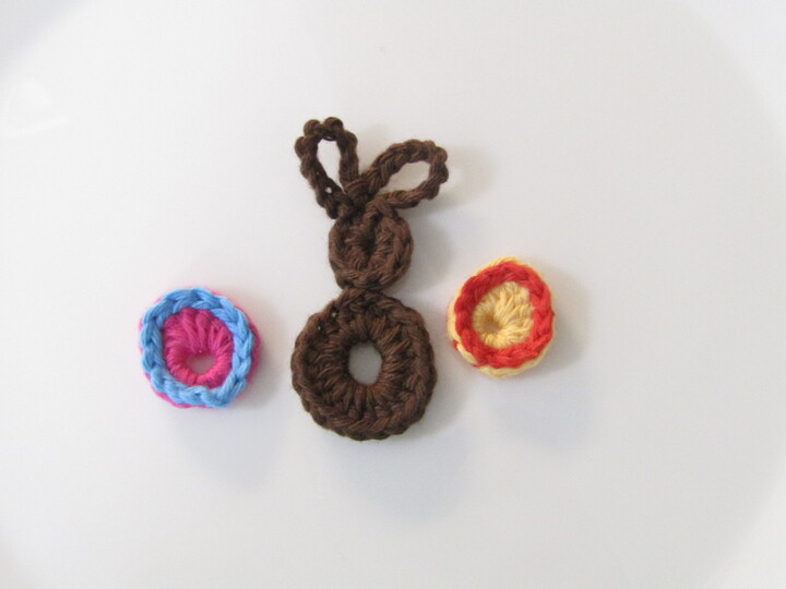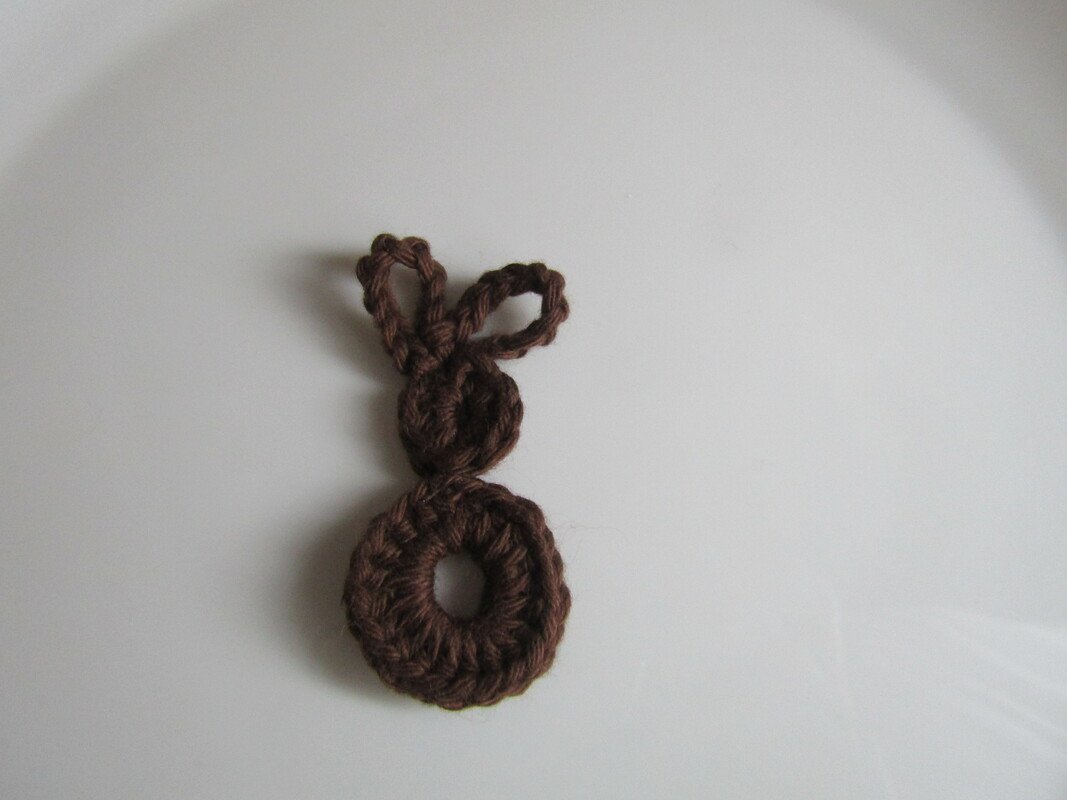Den Hasen habe ich in dunkelbraun gehäkelt, die Eier in verschiedenen Farben, jeweils 2-farbig.