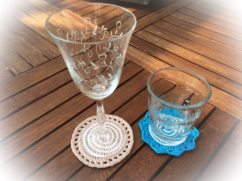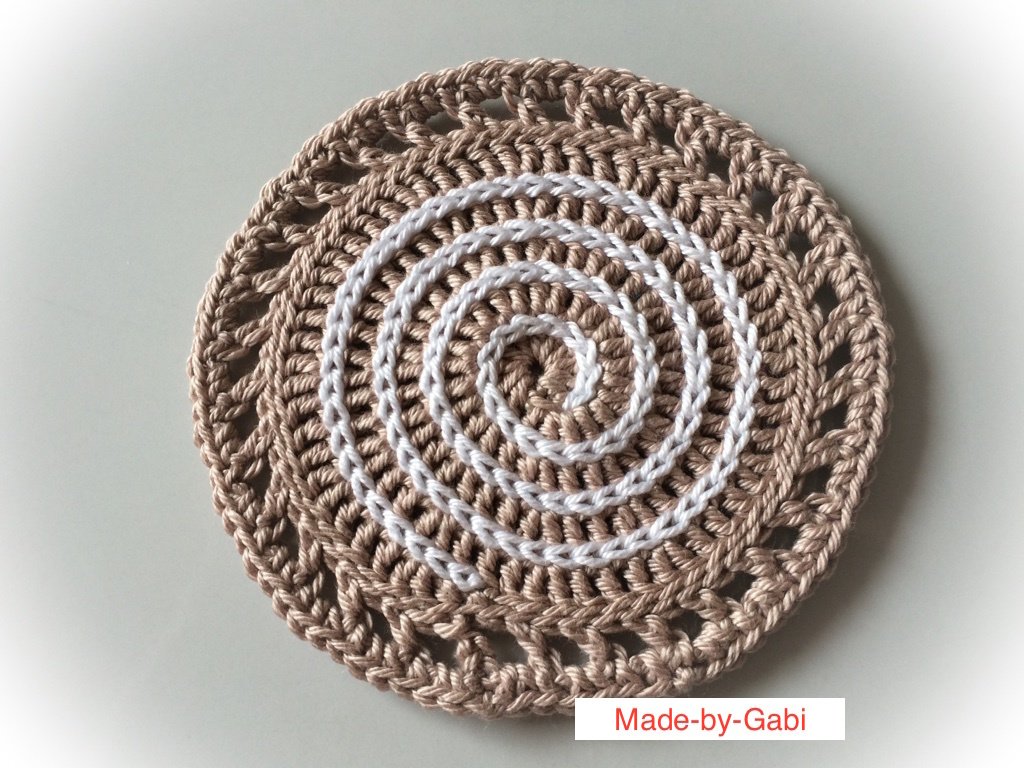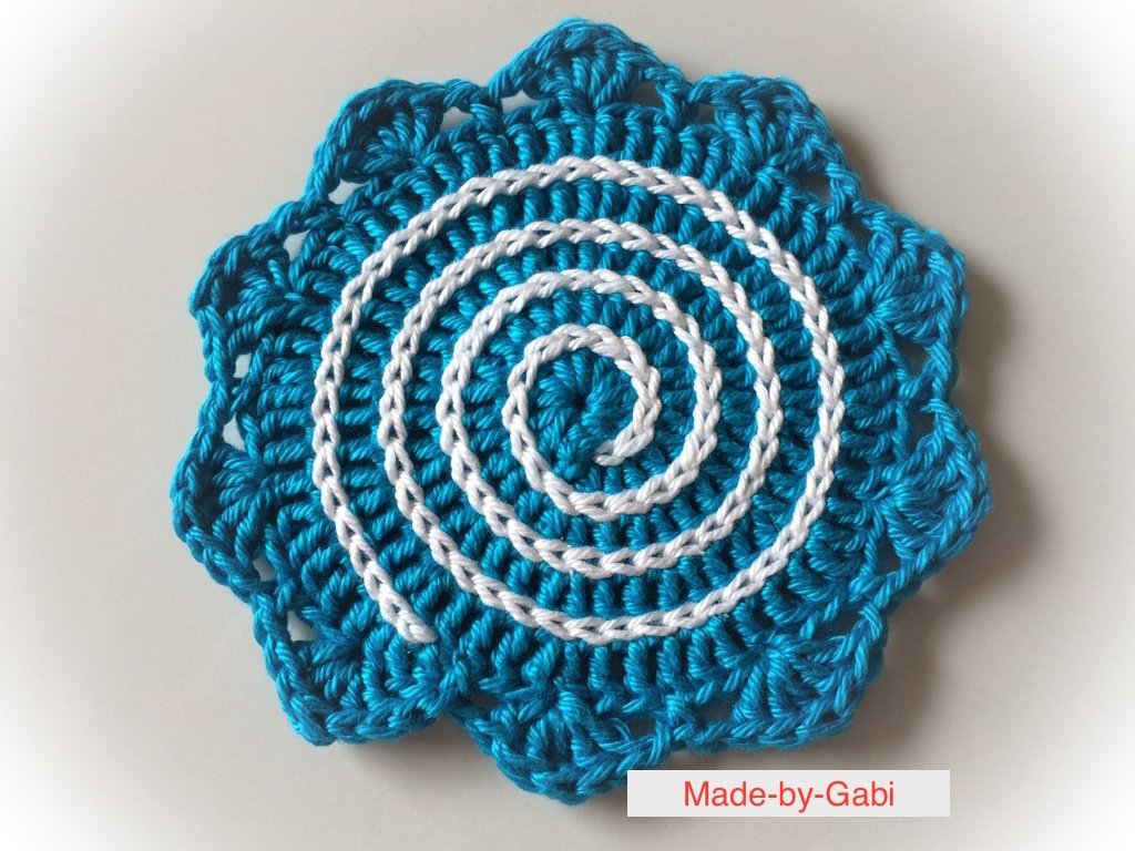 Diese Glasuntersetzer mit einer dekorativen Spirale in einer Kontrastfarbe kannst Du in 2 Versionen häkeln, beide sind in der Anleitung beschrieben.