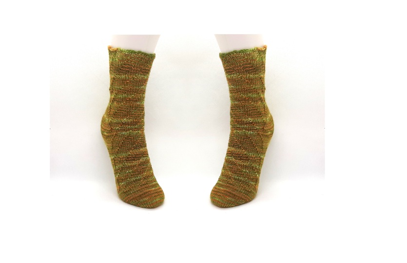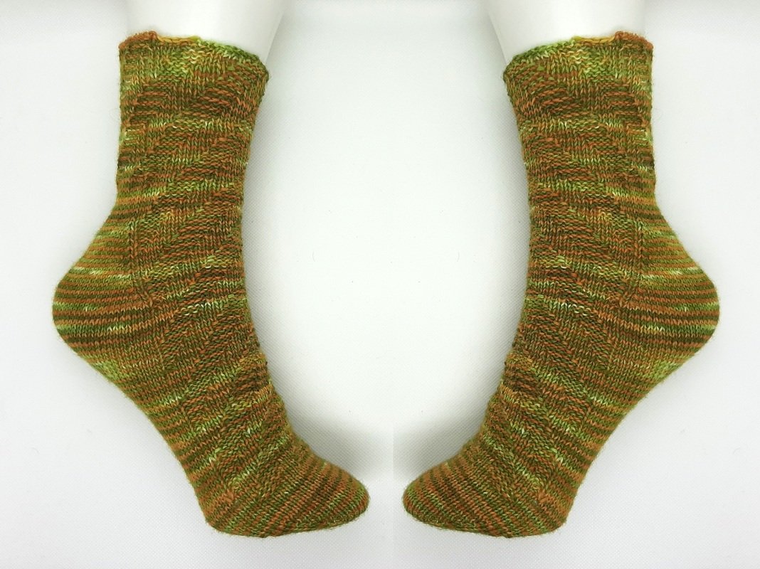 Mein verwendetes Garn für die Fixe-Ferse „Spirelli“ ist handgefärbte Sockenwolle von kreativ mit täschwerk, Leguan, LL 420m auf 100g. Meine Socke hat Gr.38/39 und eine Schaftlänge von 11 cm. Verbrauch ca. 70g/Paar.