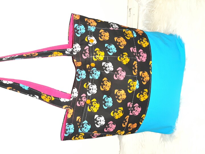 Die A-Tasche hat eine aufgenähte Extratasche, die unterteilt ist für Maske, Chip und ein kleines Desinfektionsfläschchen. All diese Fächer lassen sich leicht und schnell durch ein Druckknopf öffnen. Die Tasche hat ein Außen Stoff und Innenfutter, somit ist die Tasche stabiler für schwerere Einkäufe und da sie keine Linksnähte hat, kann die Tasche auch gewendet verwendet werden. Die Taschengriffe sind so lang, dass man sie auch bequem über die Schulter tragen kann.