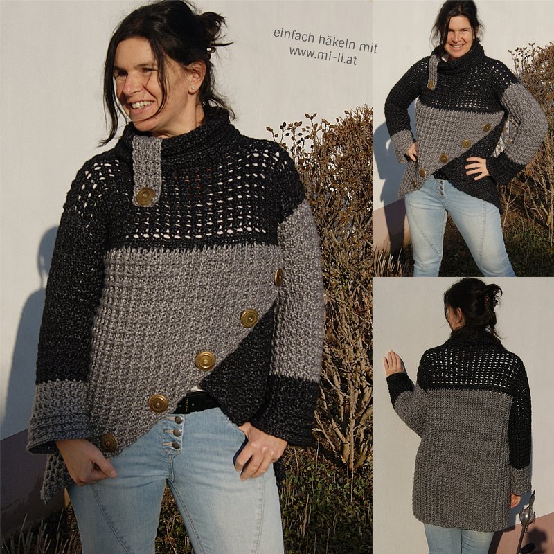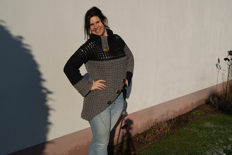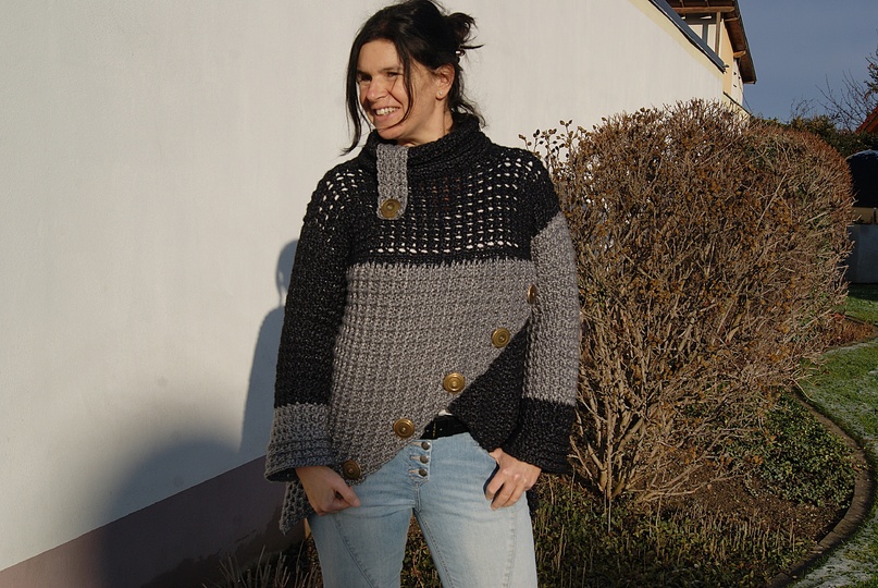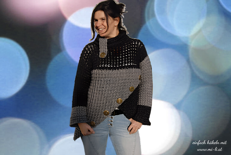 Die Anleitung ist einfach Schritt für Schritt mit Skizze, Maßen und Häkelschriften erklärt, die darunter auch genau Reihe für Reihe in Worten beschrieben ist. Der Pulli ist ganz leicht für alle Größen anzupassen.