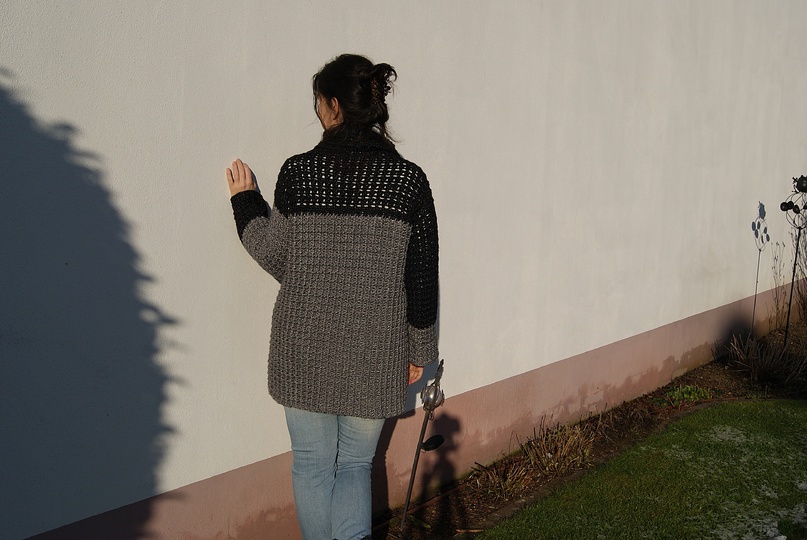 (es wird hier beim Häkeln absichtlich eine etwas größere Nadeln verwendet, als auf der Banderole angegeben, damit das Muster und somit der Pulli schön locker fällt und nicht zu steif wird)