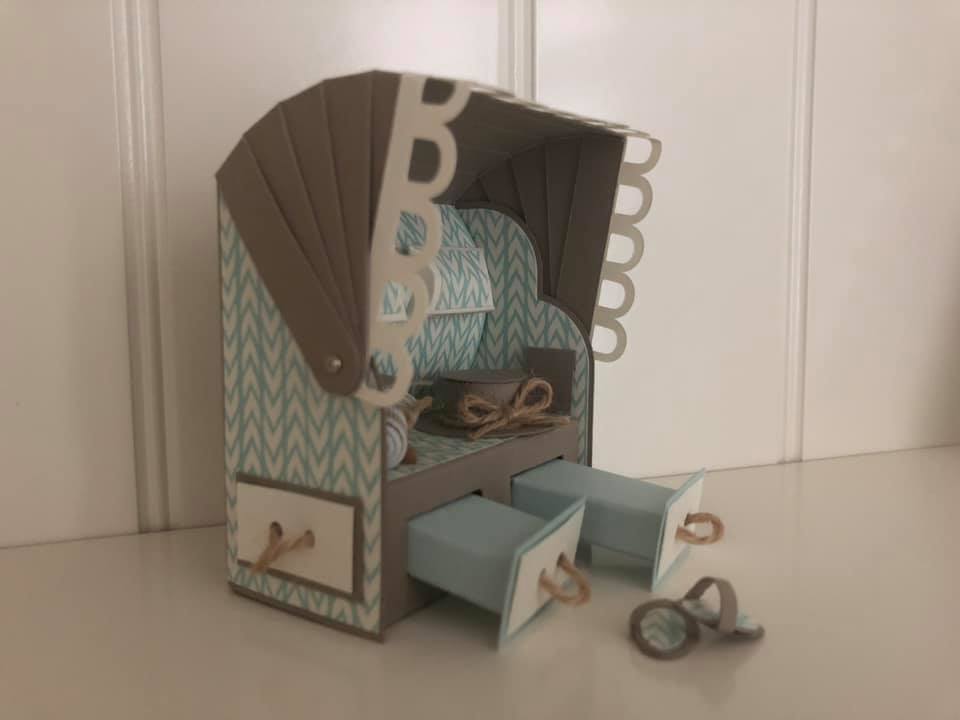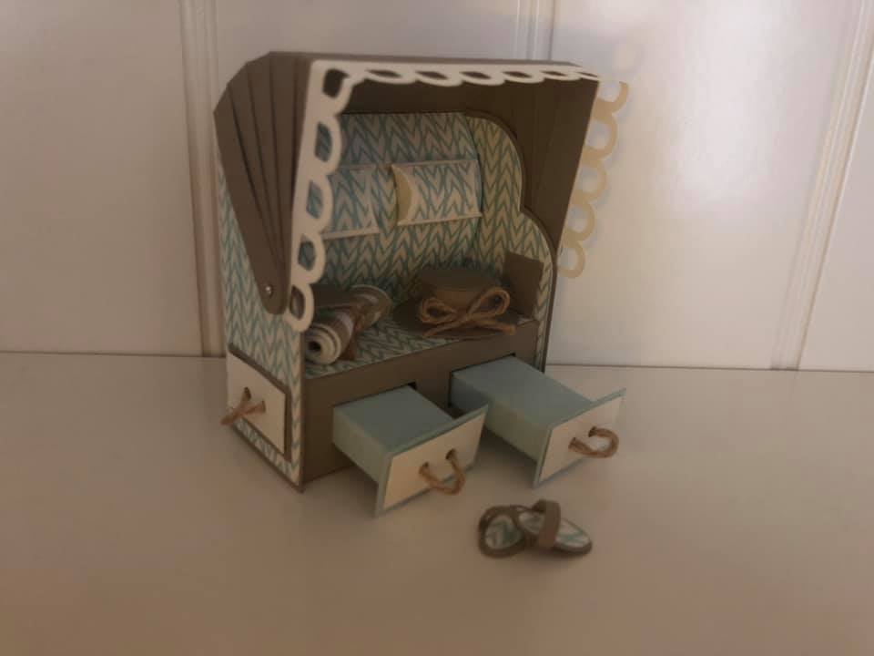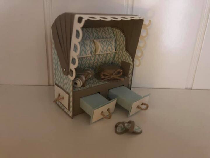 Der fertige Strandkorb passt in eine Explosionsbox und hat dann folgende Maße: Höhe: ca. 9,0 cm, Länge: ca. 7,5 cm, Breite: ca. 4,0 cm, mit ausgezogener Fußablage ca. 6,8 cm.