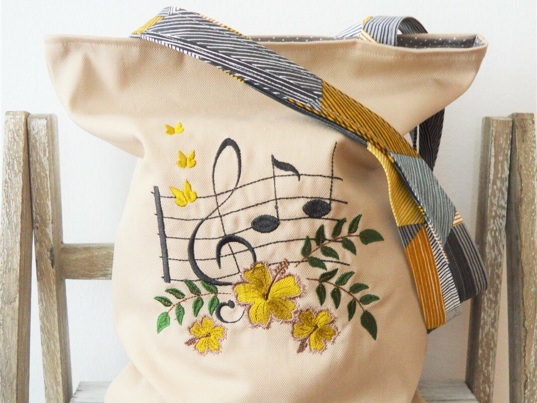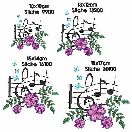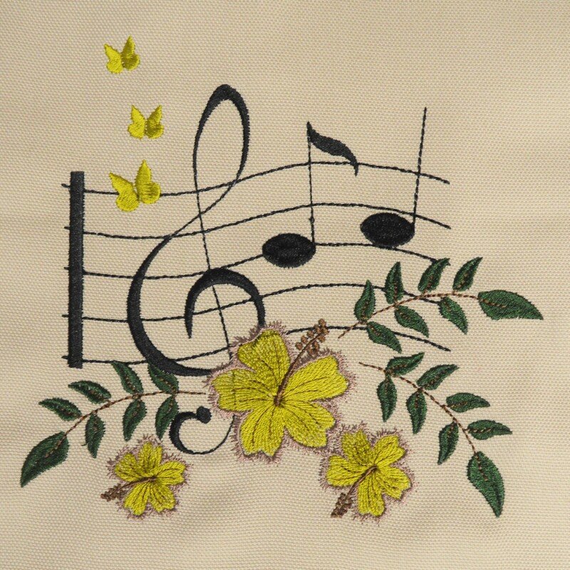 Stickdatei Notenschlüssel mit Noten, Hibiskusblüten und kleinen Schmetterlingen. Dekorative Stickdatei auf Taschen und Hüllen. Diese Datei wird voll ausgestickt und ist in 4 Größen enthalten.