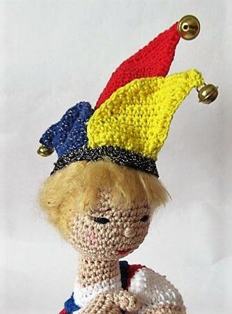 Der Türkranz hat einen Durchmesser von 12 cm. Die Narrenkappe misst etwa 15 x 12 cm. Als Puppenhut passt sie Puppen mit einem Kopfumfang von etwa 14 - 15 cm.