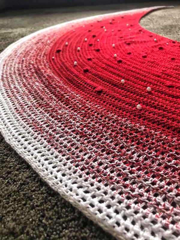 Das Tuch kann aber auch ohne „Böhnchen“ gehäkelt werden und eignet sich grossartig, um in den einzelnen Reihen zu experimentieren. Für das oben gezeigte Tuch habe ich 1000 Meter vierfädiges Garn verwendet und mit einer Nadelstärke 3,5 gearbeitet. Die Sichel hat (so wie es liegt) ungespannt einen Durchmesser von 1,5m und misst an der breitesten Stelle 45 cm.