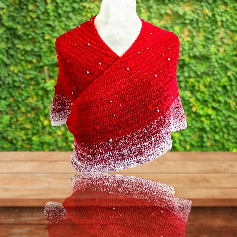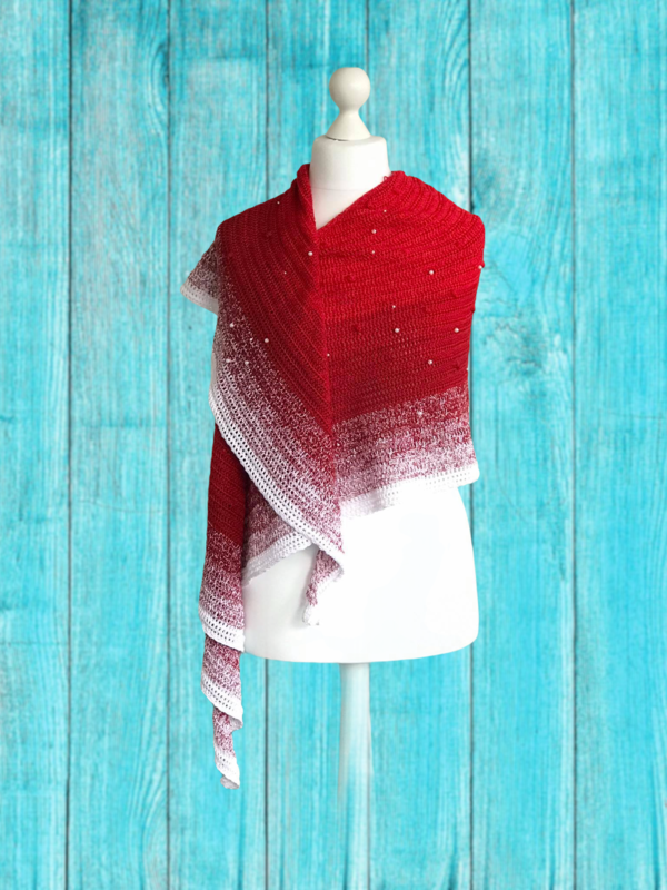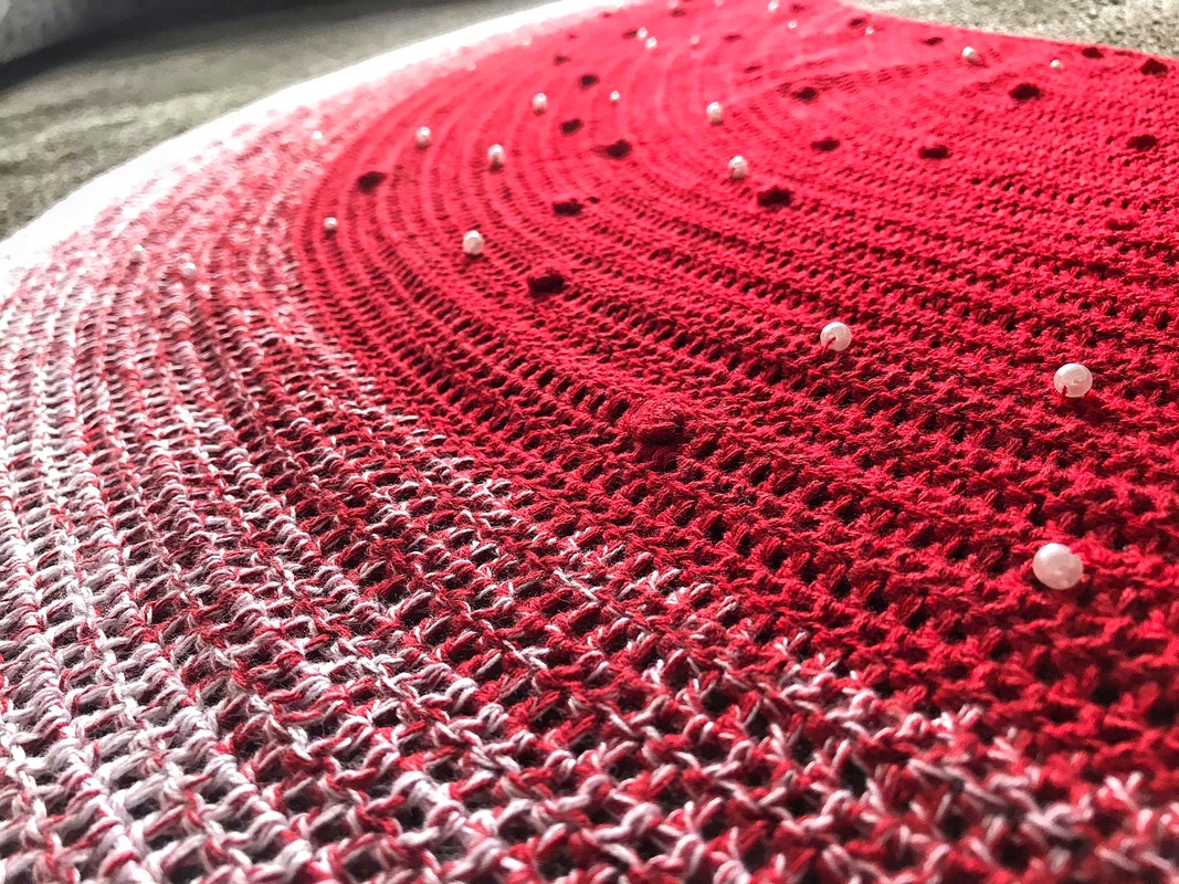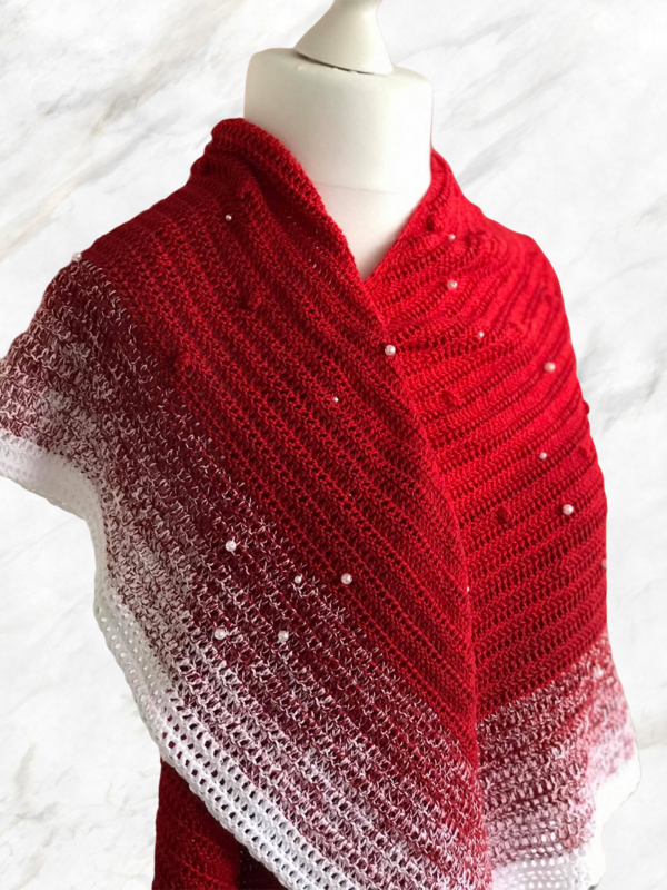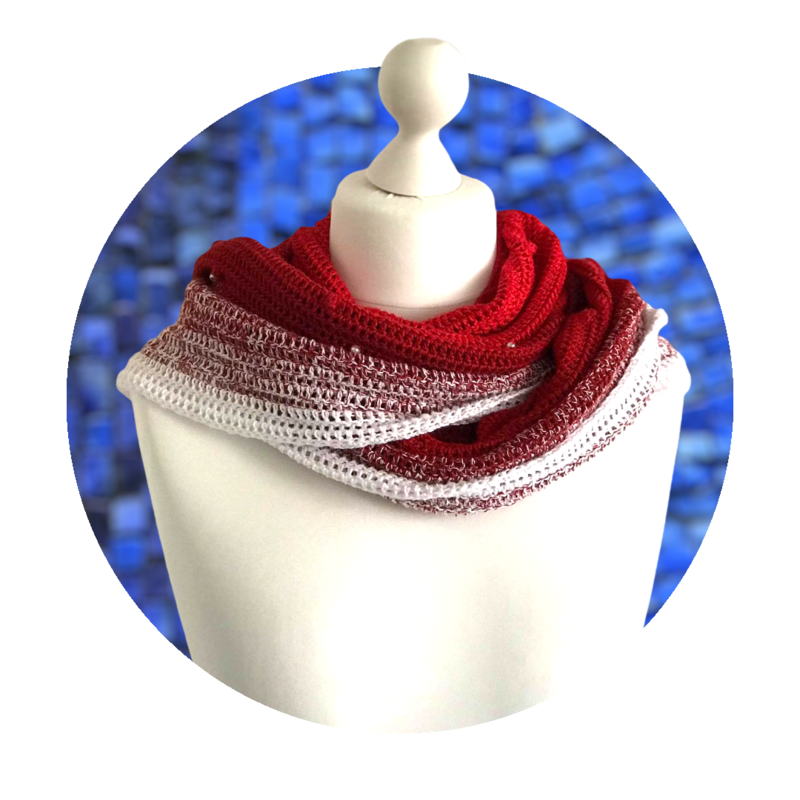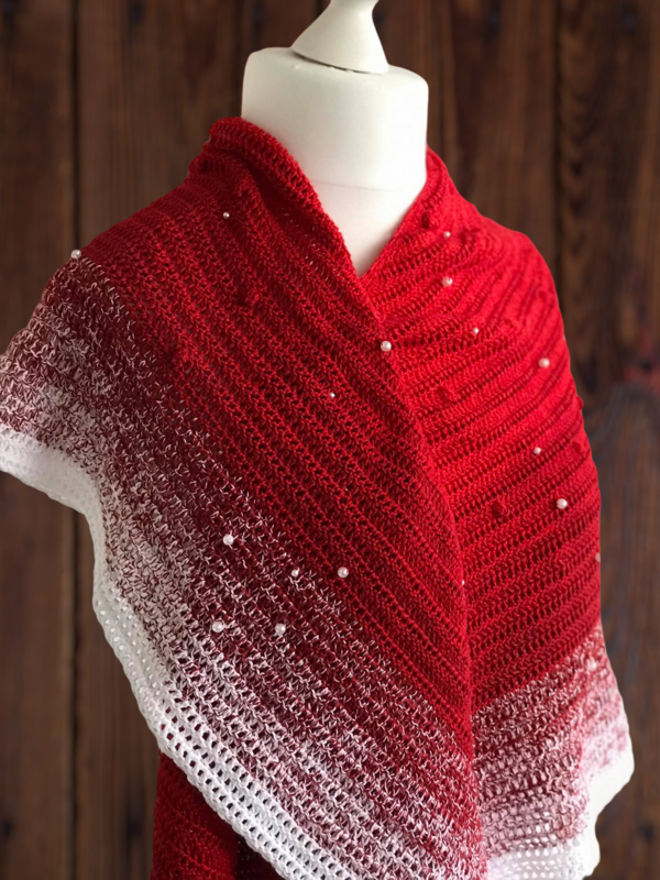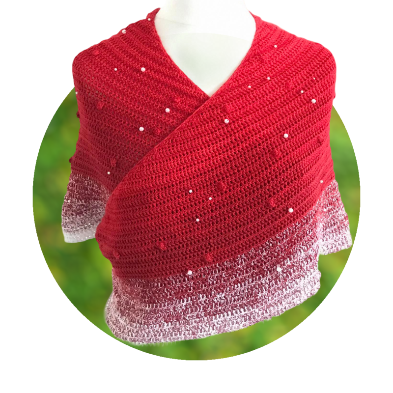 Häkeltücher gibt es in vielen Variationen. Neben Dreieckstüchern sind aktuell Tücher in Sichelform beliebt. Ich möchte euch mit dieser Anleitung eine simple Methode zum Häkeln eines Tuches in Sichelform vorstellen. In der abgebildetes Variante habe ich das Garn „Fliegenpilz“ verarbeitet. Einen Kontrast zu den Perlen bilden die „Knubbelchen“, die in der Häkelsprache unterschiedlich bezeichnet werden aber in der Regel als „Böhnchenmuster“ bekannt sind.