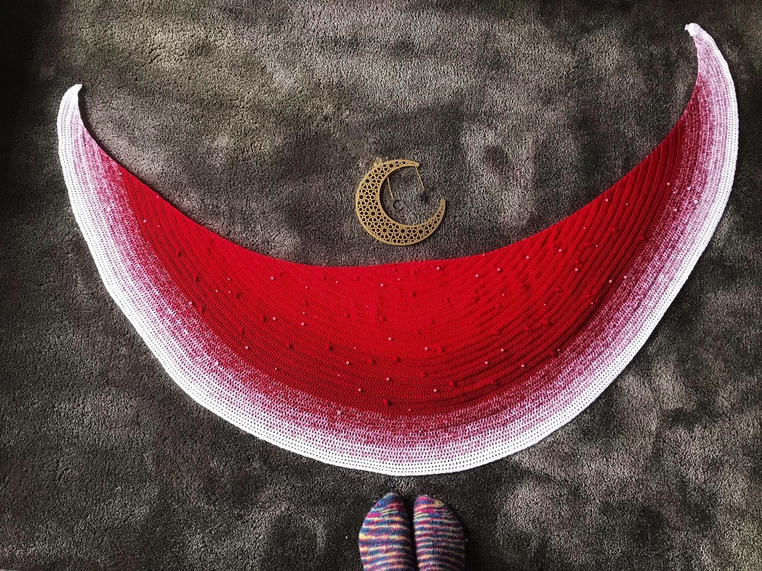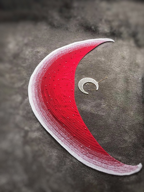 Du kannst mit jedem Garn arbeiten - das abgebildete Tuch hat einen ungespannten Durchmesser von 1,50. Die Sichel misst an der breitesten Stelle 45 cm.