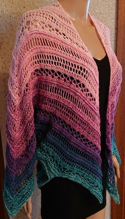 Die Jacke Ruth ist ein Kleidungsstück mit langen Ärmeln, für das KEINE extra Ärmelbobbel benötigt werden. Daher ist er perfekt für Farbverlaufsgarn geeignet.