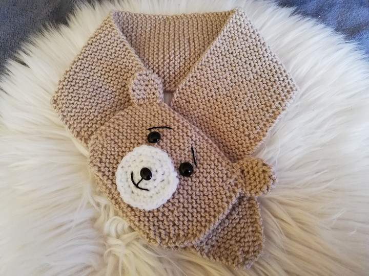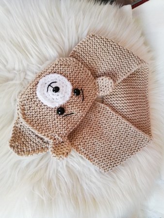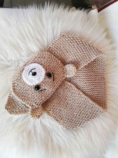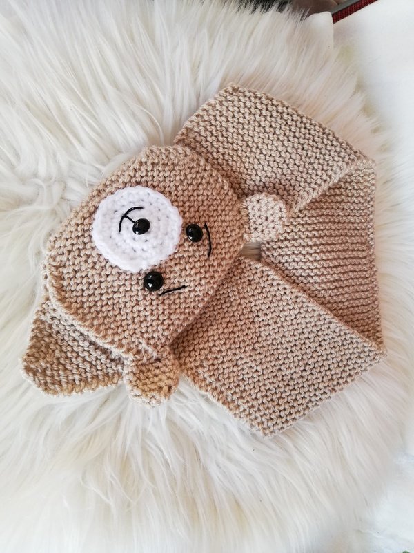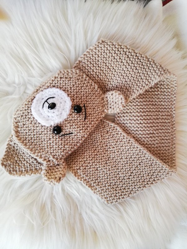 Gestrickt wird mit Rellana Caprice 137 m, ein Knäuel in Hellbraun hat für diesen Schal schon gereicht. Ein Rest Beige reicht für den Rest aus. Mit Nadel Nr.4 hat der Schal eine perfekte Dicke und hält den Hals schön warm. Bitte beachte, dass Augen, Schnauze und Ohren gehäkelt werden.