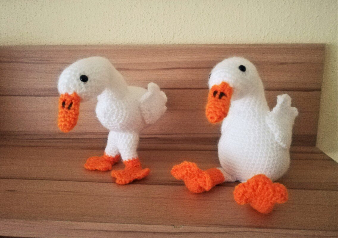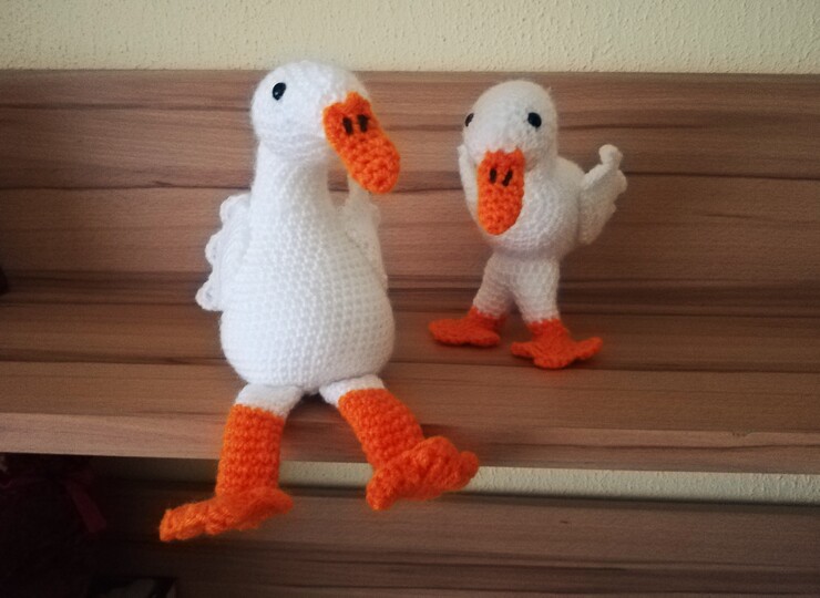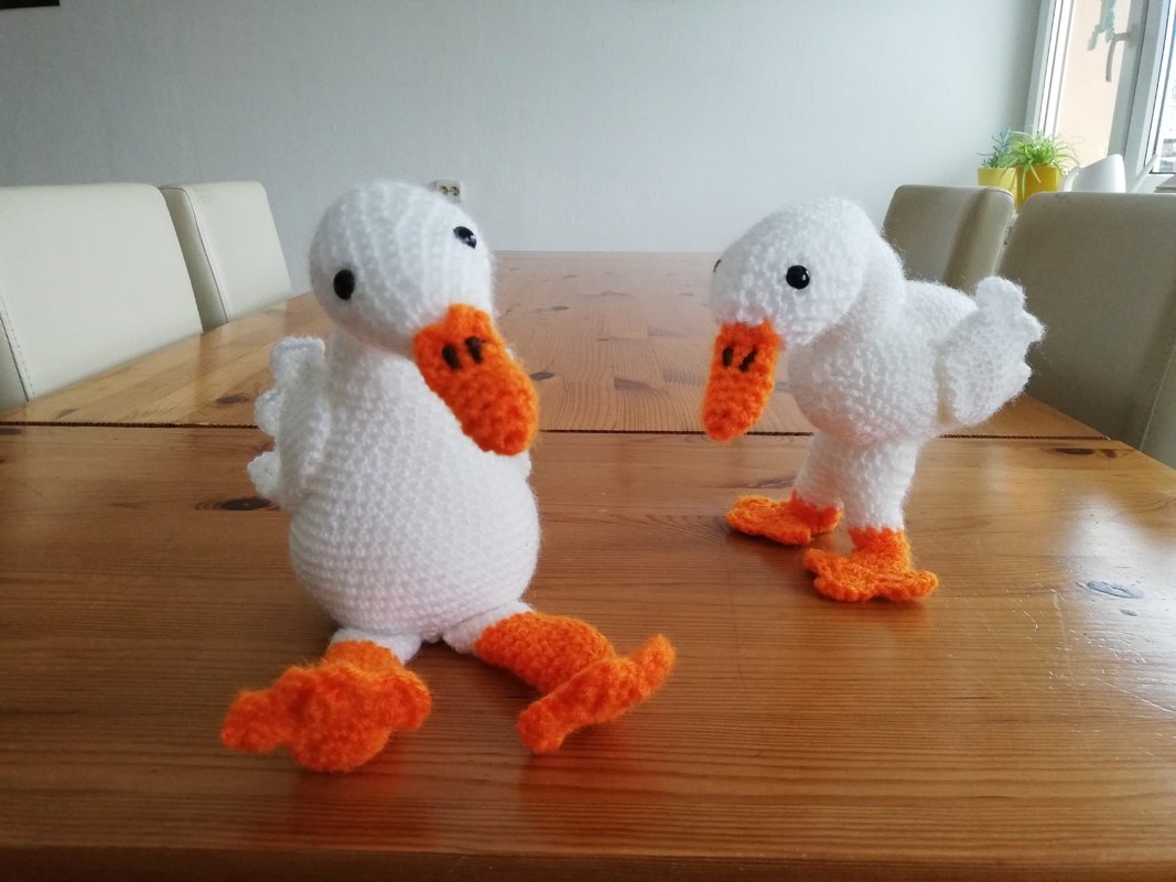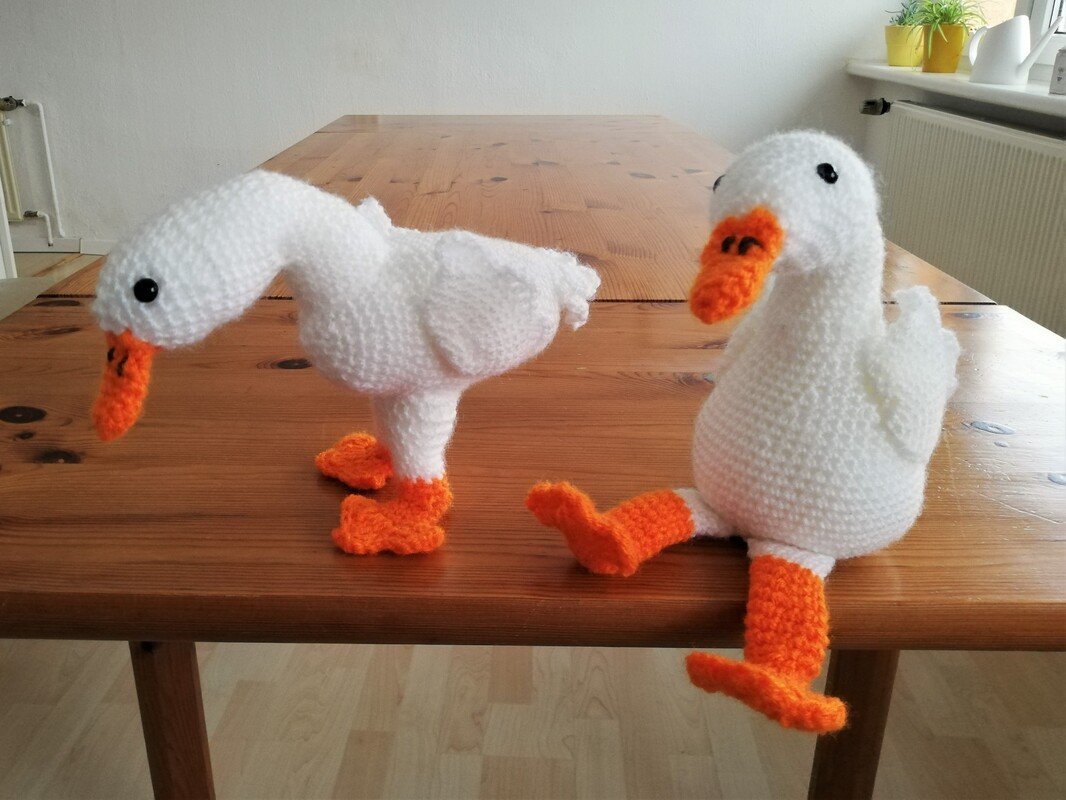 Beide Gänse sind ca. 18 cm hoch. Je nach verwendetem Garn kann die Größe natürlich variieren.