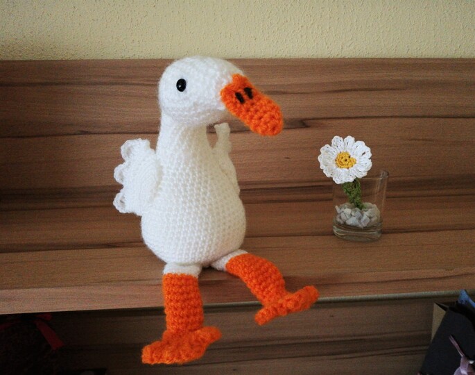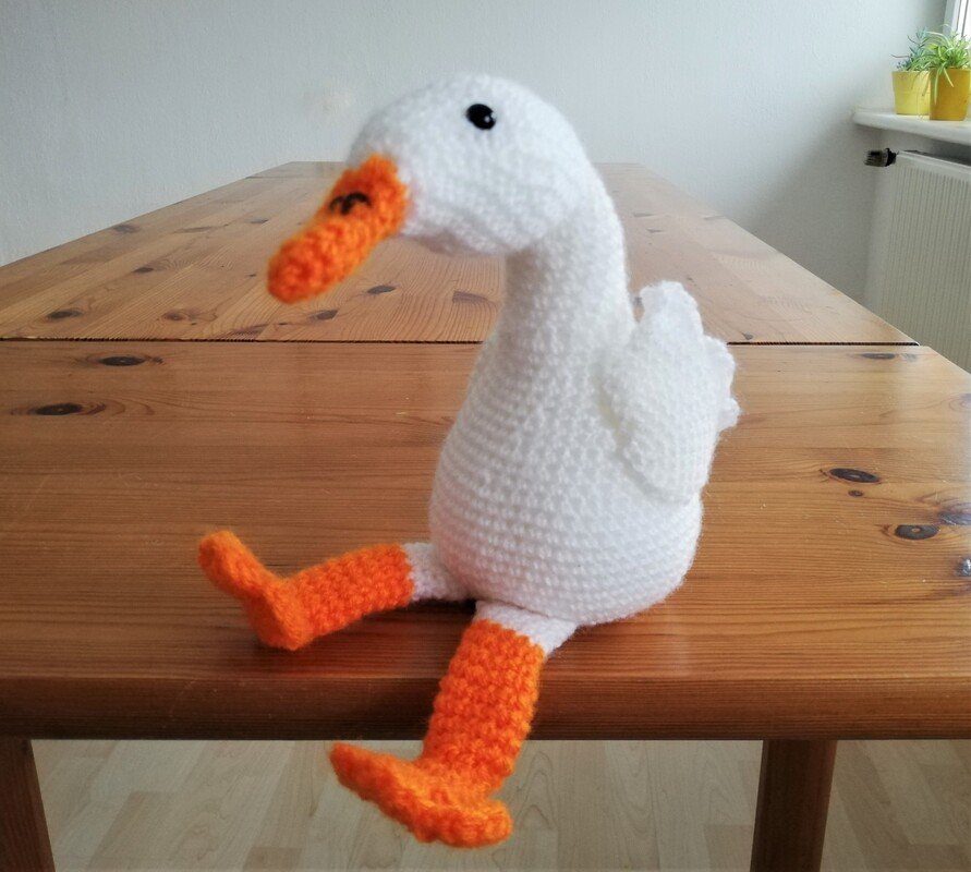 Greta kann auch ohne Unterstützung von Draht frei stehen, man kann beide Gänse also auch in der Waschmaschine waschen.
