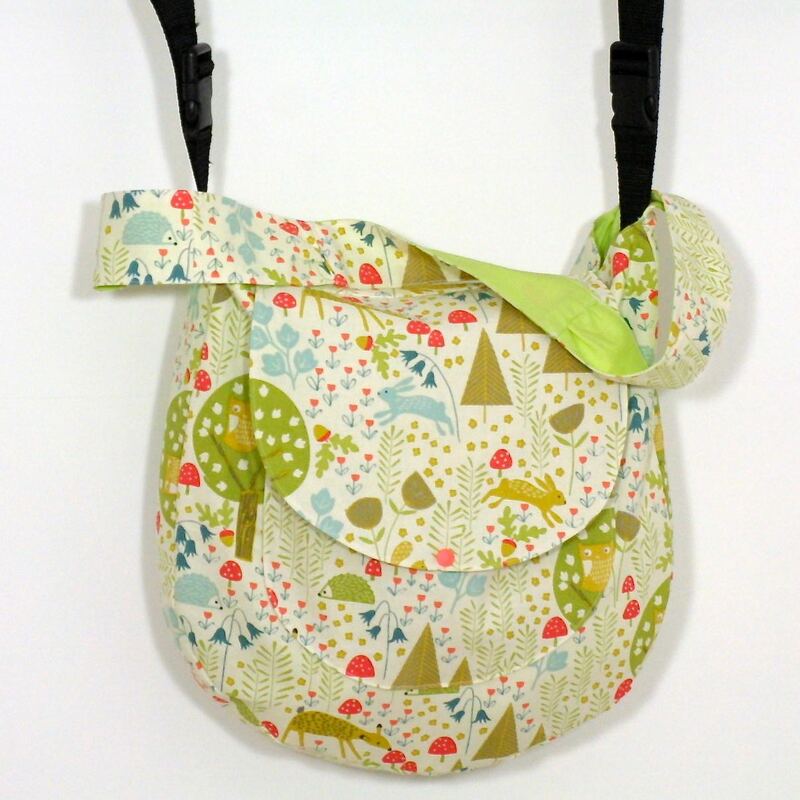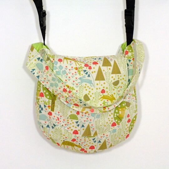 Um Weiteres schnell griffbereit zu haben, gibt es außen eine aufgesetzte Tasche. Aufgesetzte Tasche und die Lasche werden mit einem Druckknopf geschlossen. Die Lasche hält die Tasche auch in unbeaufsichtigten Momenten geschlossen. Die Tasche hat einen Henkel, der so lang ist, dass er über die Schulter passt. Am Kinderwagen wird die Tasche durch leicht bedienbare Steckschnallen an stabilen Gurten gehalten. Dies kann auch am Einkaufswagen geschehen.